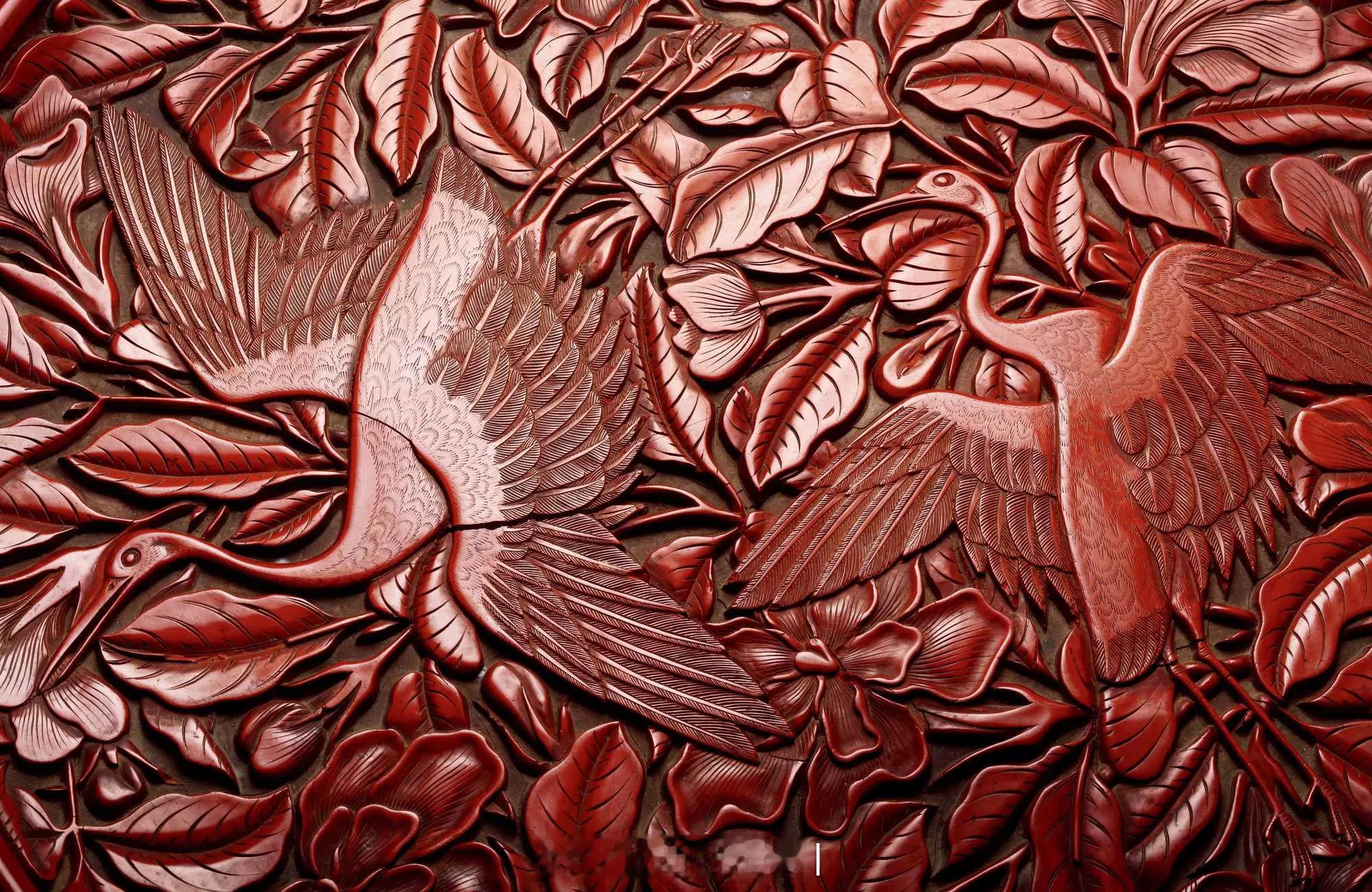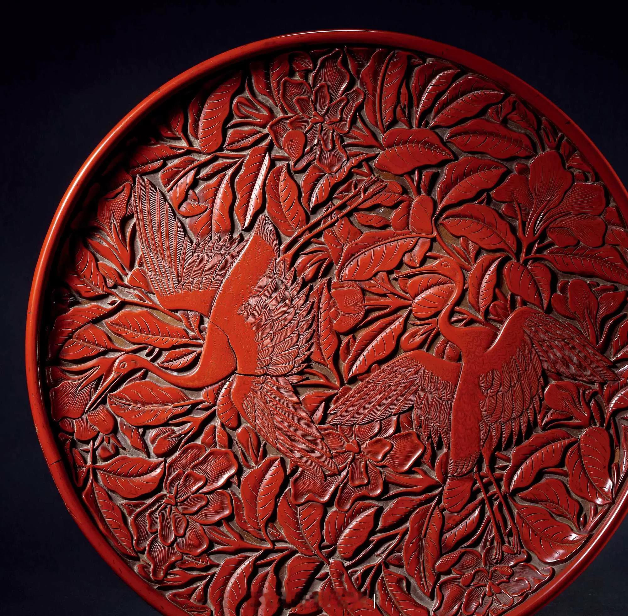 髹饰录 | 元末明初 剔红双鹤茶花图盘本品通体髹朱漆,雕饰花卉双鹤纹,漆层肥厚,刀口断面可见黑线,线条优美与盘面纹饰交相呼应,光泽蕴亮,雕工精细,刀锋犀利,刀口深峻,委婉流畅。因年代久远而有干燥细纹,但却更加凸显其历史价值。盘底髹黑漆,光可鉴人,近足处一隅落“张成造”针划细款,张成作品通常髹厚漆,故“叶厚花肥,极富质感”。国内馆藏中能确认为张成制剔红的器物实例不多,却都同样精致。其中最为珍贵就得数北京故宫博物院的“元 张成造剔红栀子花纹圆盘”,为清宫传世旧藏,这是文物界公认的一件“张成造”剔红作品,至今保存完好,“无论在雕漆史还是在漆艺史上都具有标的性意义。”木质漆器。素胎为木制。盘体较矮,配有略深的圆形底足。外底与底座以黑漆涂饰,口沿部分采用圆边设计。内壁以黄漆为底,中央左右各绘一对展翅飞翔的鹤,其间密集排列着全开、半开的花朵与花蕾等图案。盘体外壁以黄漆为底,环绕着香草纹样。内壁与盘体外壁的朱漆层之间有一条黑线。剔红、剔黑、剔犀(屈轮)等雕漆技法日益发达并迎来兴盛期可以说是元代。并且,这个时代制作的漆器的最大特征是作品本身充满了力量,这是元代雕刻漆的一大特点。事实上,我们可以通过遗存的器皿感受到元代的这一特征。具有这个特点的作品恰恰因其存世量少而备受珍视。这件圆盘最引人注目的特点,无论如何都是其将花纹分别雕刻在漆层上、下,采用了两段雕刻的手法。这种手法是从南宋时期开始流传,特别在元朝时期流行。其后,在明朝初期的大约永乐时期的为数极少的作品中使用过,之后便再也看不到了。仅就这件圆盘来说,将鹤以及梔子的茎、叶、花蕾的一部分表示在下层部分这一点,可以认为显示了这件花鸟剔红盘的特征。另外,黑漆涂漆的外底中央有“佛”的针刻铭,但意义不明。如果任由想象的话,也许可以考虑本件作品是与佛教寺院有关的东西,在那里被使用过。这件圆盘传到了茶道家元的手中,应该是作为放置香炉的盘子使用的。备注:日本关西茶道家族收藏尺寸:直径32cm来源:保利2025秋拍《醉花荫—海内外名藏漆器》