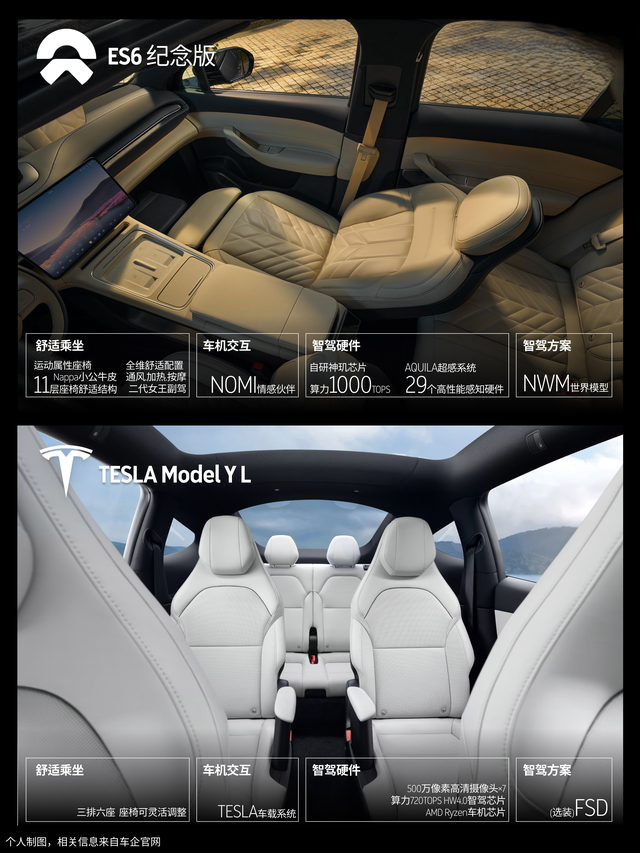 es6和modelyl,这么选最合理 完全不同的驾驶风格,完全不同的产品定义,却对应着极为相似的客户群体; 这两台车之间,又有多少人陷入了彷徨…… model Y L:从其6座+brembo四活塞定钳的配置上看,就知道这是一台迎合(shi ying)中国市场的乘用车。当然,在中国,你以为有6座就要坐6个人吗?人们无非是追求二排乘坐的舒适度罢了,model Y L,在Y的体系内,做到了。 es6: 这是目前国内30万以上纯电suv中的销冠产品,它很好得抓住了中国家庭对于5座suv的需求(空间,质感,智能,补能方便,服务好)。目前经历过几轮产品更新后,已达到了现有技术平台下最好的产品状态了。 如果你是老司机,且有意在家庭用车的基础上兼顾驾驶乐趣,那可以考虑Y,前提是你的家人能接受Y的”毛坯“(设计风格背后是一种生活态度); 如果你是新司机,亦或是希望用车方便、无忧的老手(俗称奶爸),那就买es6,毕竟女生一般都不太会反对
