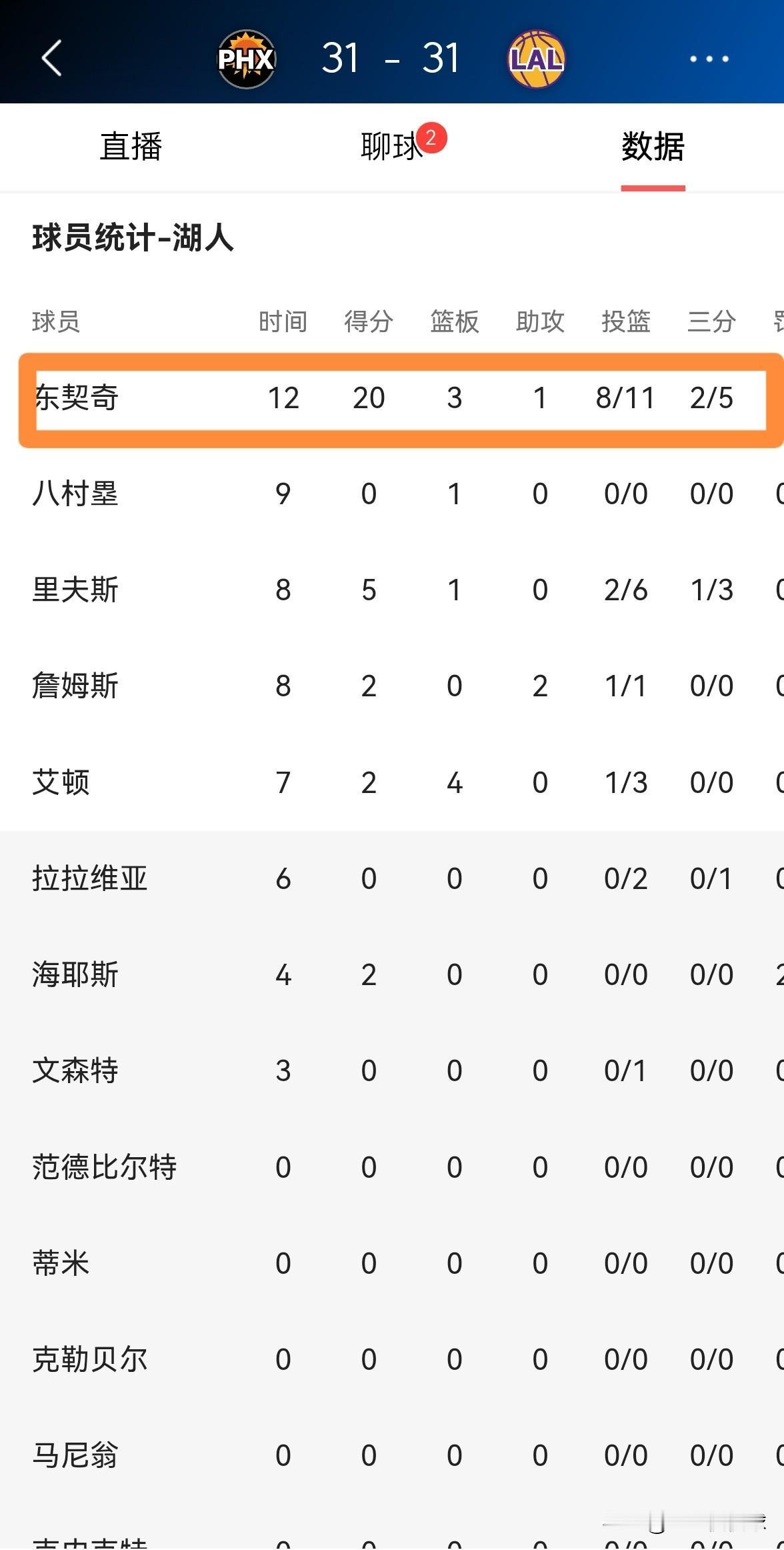 湖人超级巨星东契奇真是太爱显摆了!在今天湖人主场迎战太阳的首节比赛中,东契奇大秀自己的得分能力。在第一节比赛中,东契奇首发出战12分钟,投篮11中8,其中三分球5中2、罚球2中2爆砍20分3篮板1助攻,他的场上正负值为0。 作为球队的核心控卫,东契奇在12分钟的上场时间里仅仅送出了1次助攻,却疯狂的出手11次,这正常吗?
