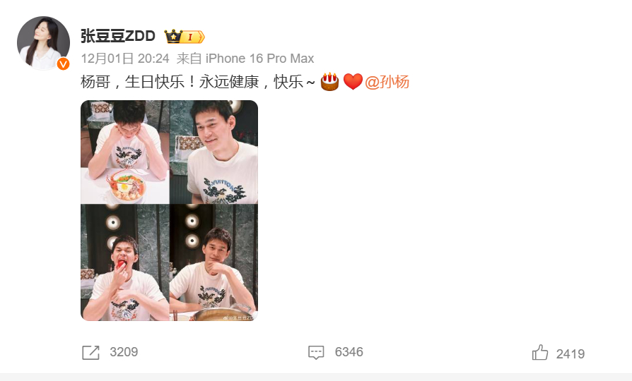 张豆豆晒照为孙杨庆生 12月1日是的生日,张豆豆晚间晒四宫格照片为老公孙杨庆生。