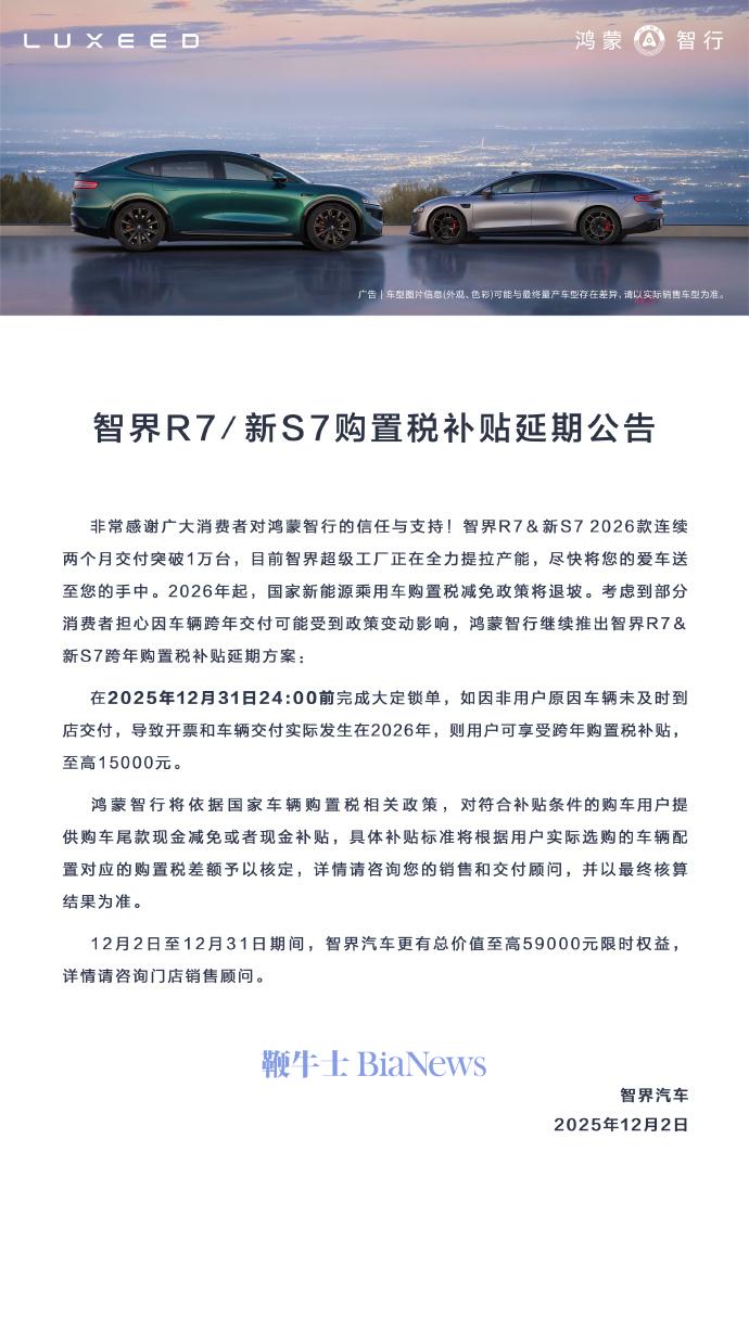 今日,鸿蒙智行智界汽车发布了智界R7、新S7购置税补贴延期公告。