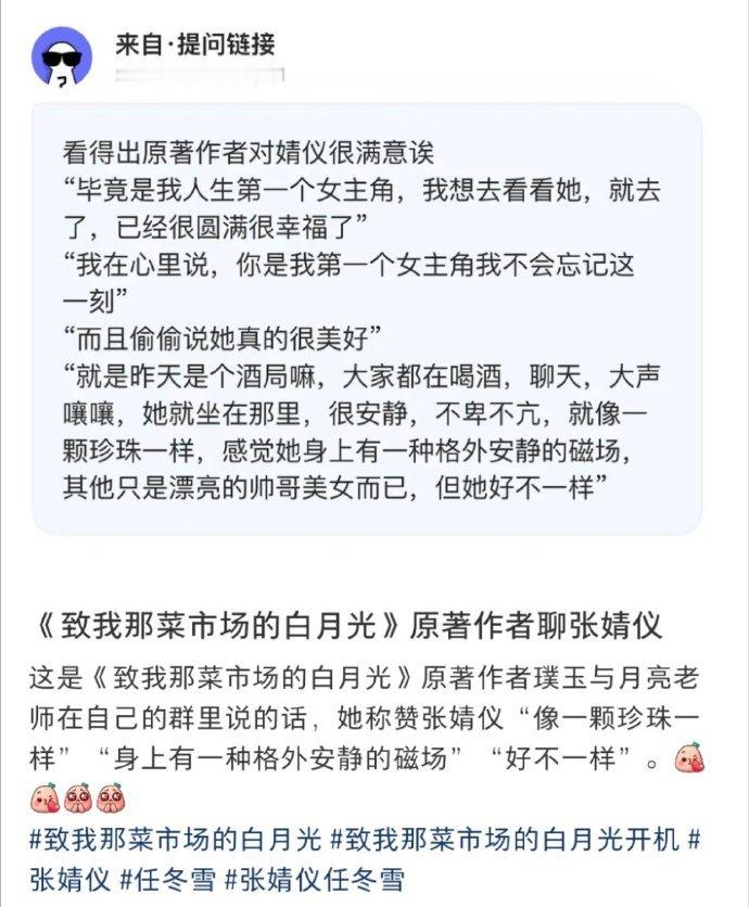 致我那菜市场的白月光作者聊张婧仪谁不为这种双向奔赴动容!作者把人生第一个女主角交给张婧仪,还盛赞她如珍珠般美好,圆满感都要溢出屏幕了~ 致我那菜市场的白月光原著作者聊张婧仪