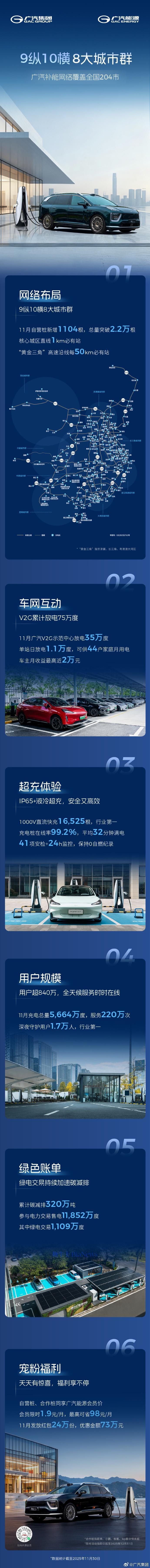 截至今日,广汽充电站已超1800座,充电桩超2.2万根,覆盖全国31省204市,核心城区直线1km必有站。