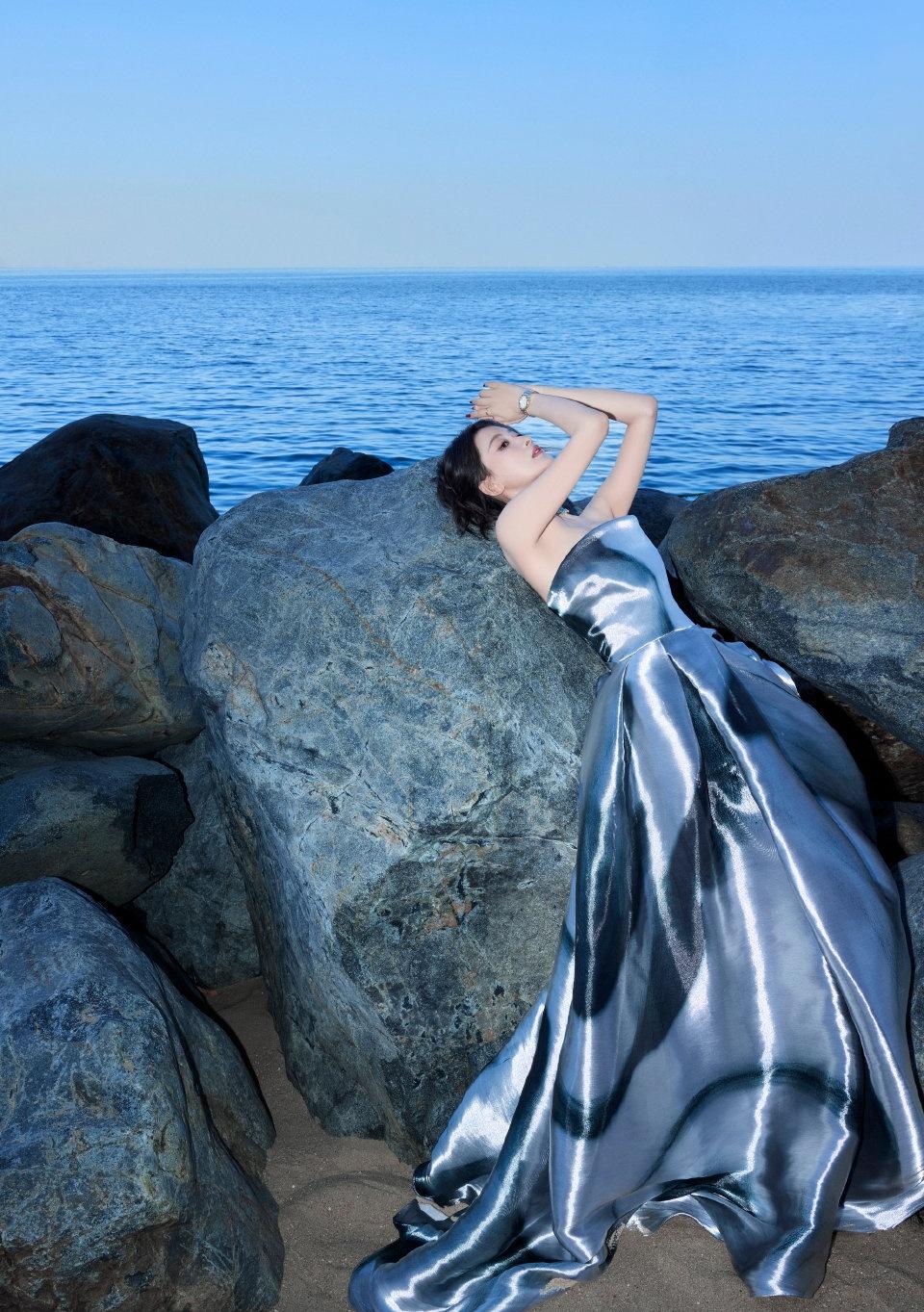 孙怡身着银色抹胸缎面长裙漫步海边,裙摆如海浪般灵动轻盈,与背景融合,美得自然。