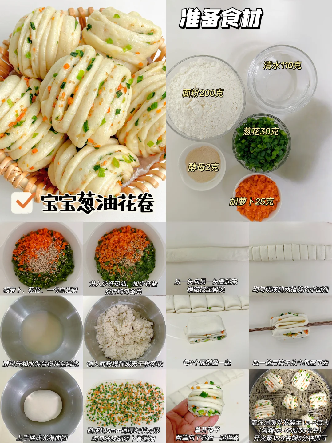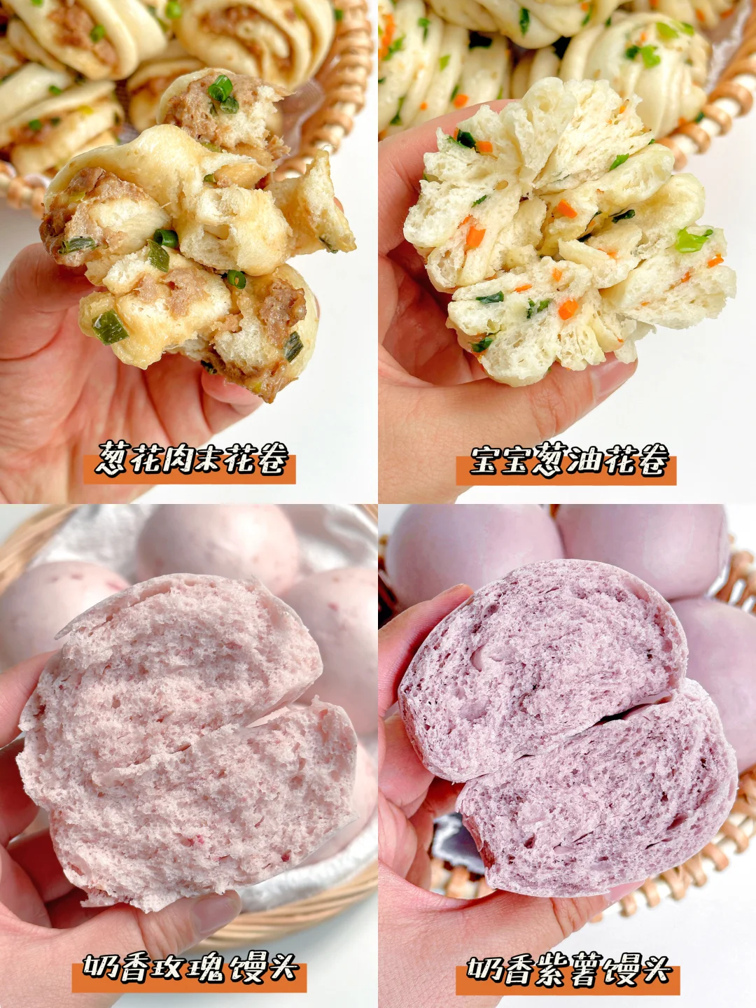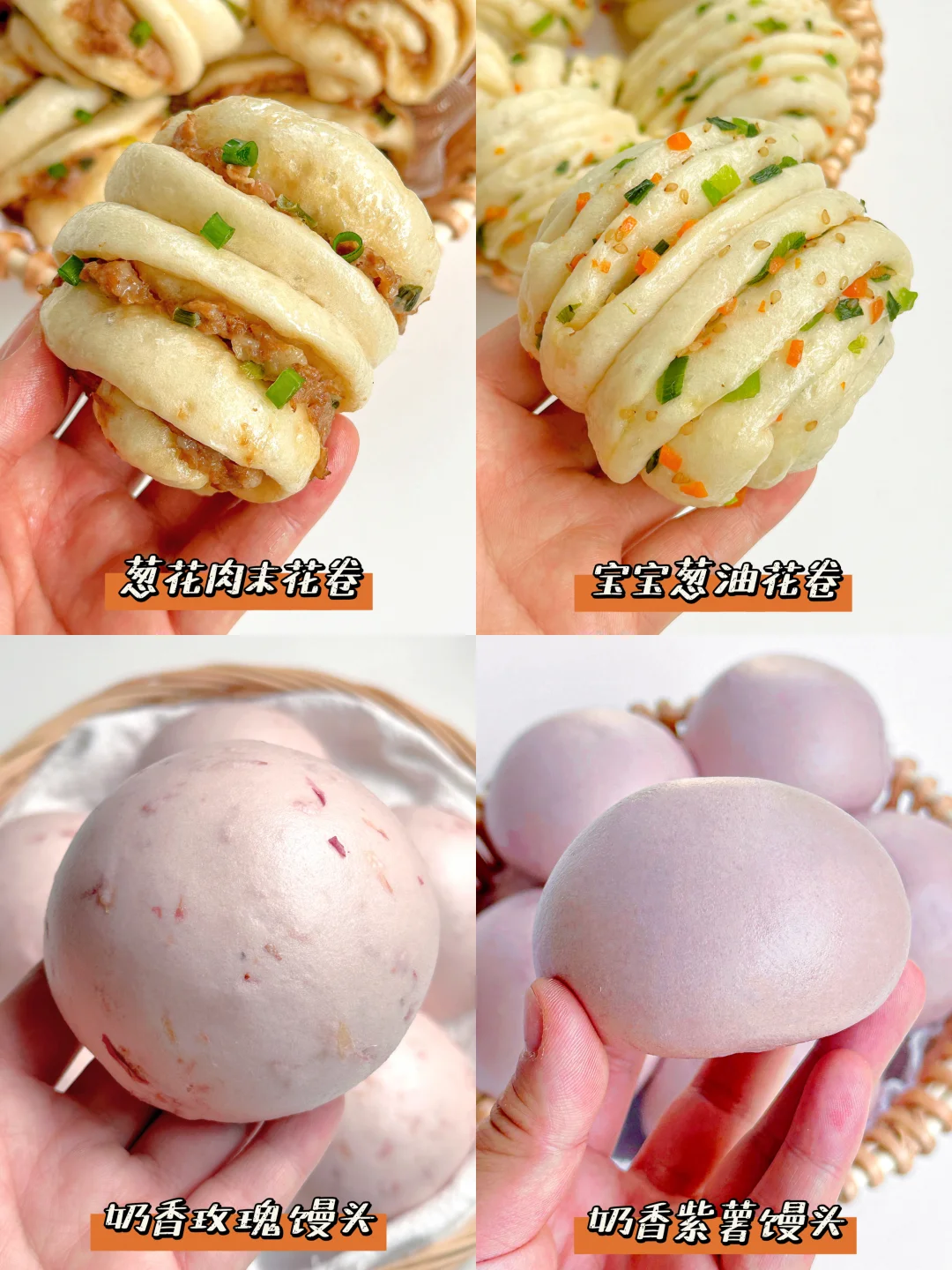 大家好呀!☺️ 宝宝很适合吃馒头、花卷这些易消化的发面食物哦!今天整理了4款,诺宝平时爱吃的馒头花卷,每一款都蓬松暄软,易抓握,易消化,做法也很简单。一次多做点冻起来也很很省妈哦!姐妹们,快来安排! ✅宝宝葱油花卷 ✅葱花肉末花卷 ✅奶香玫瑰小馒头 ✅奶香紫薯小馒头 👩🍳具体做法和用量,请参考以上图片文字,如有疑问欢迎评论区留言交流~~~