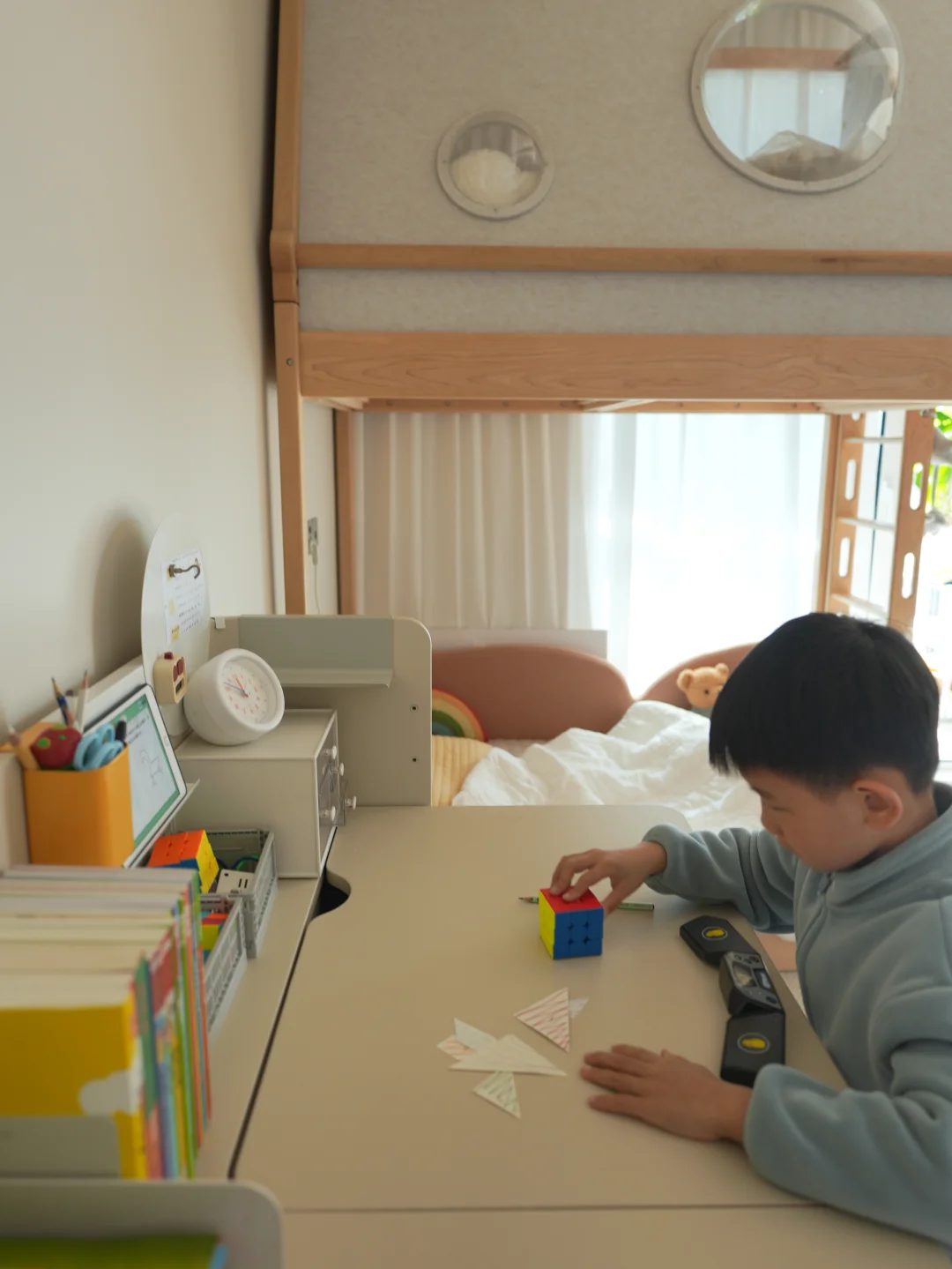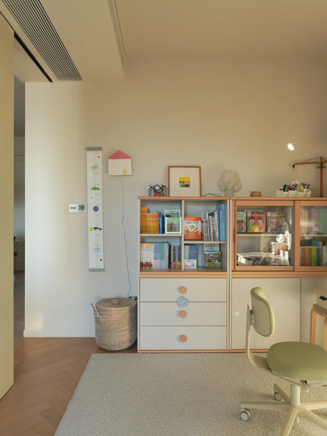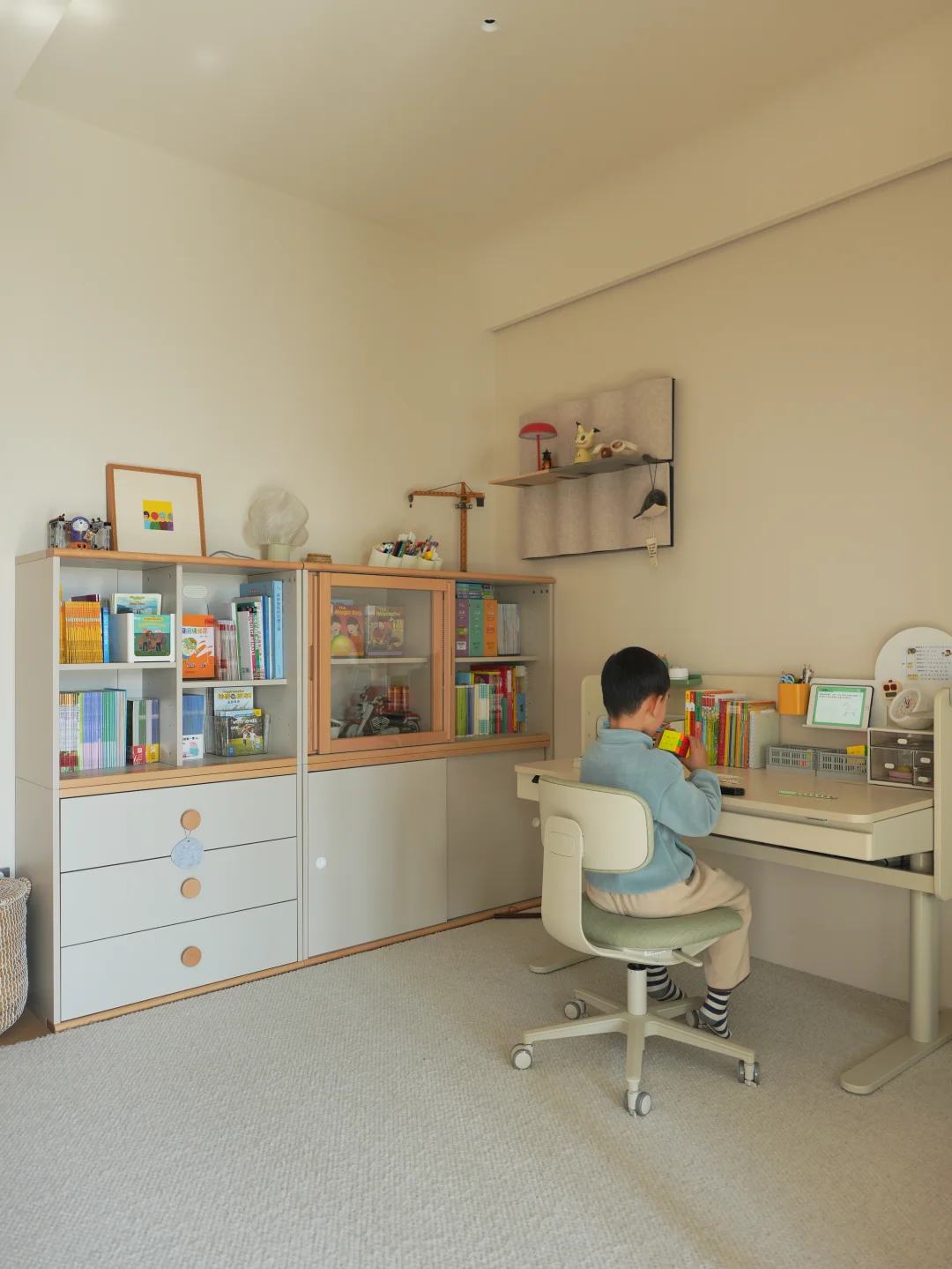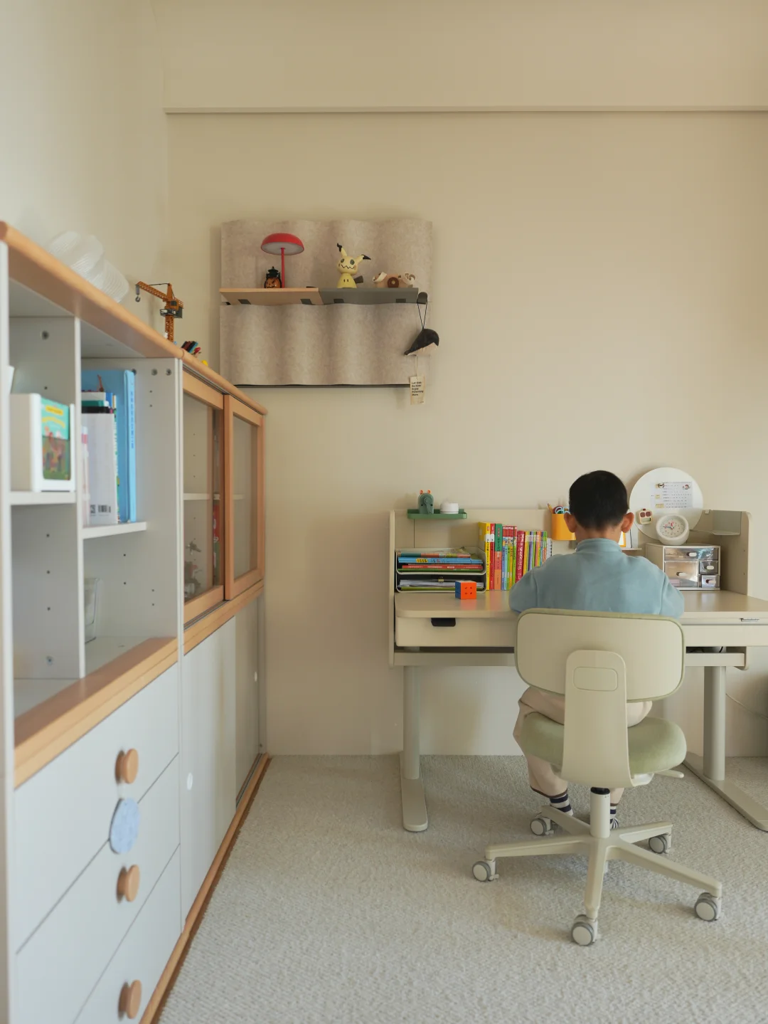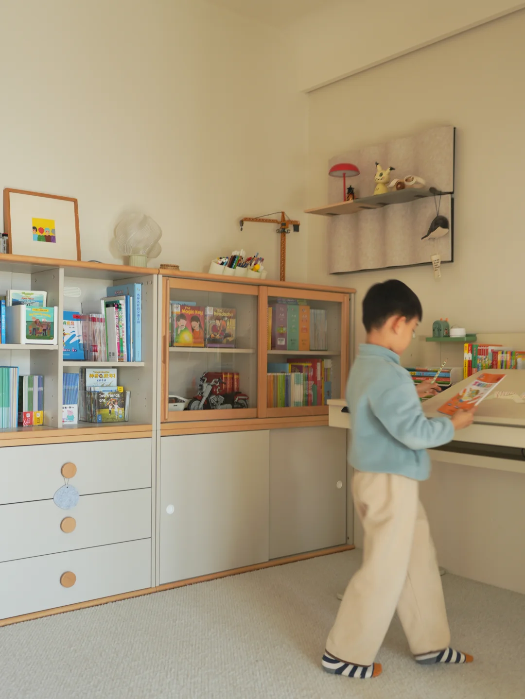 可以长高的模块化的收纳柜,从小时候的一层增加到现在的两层,高度和身高适配。