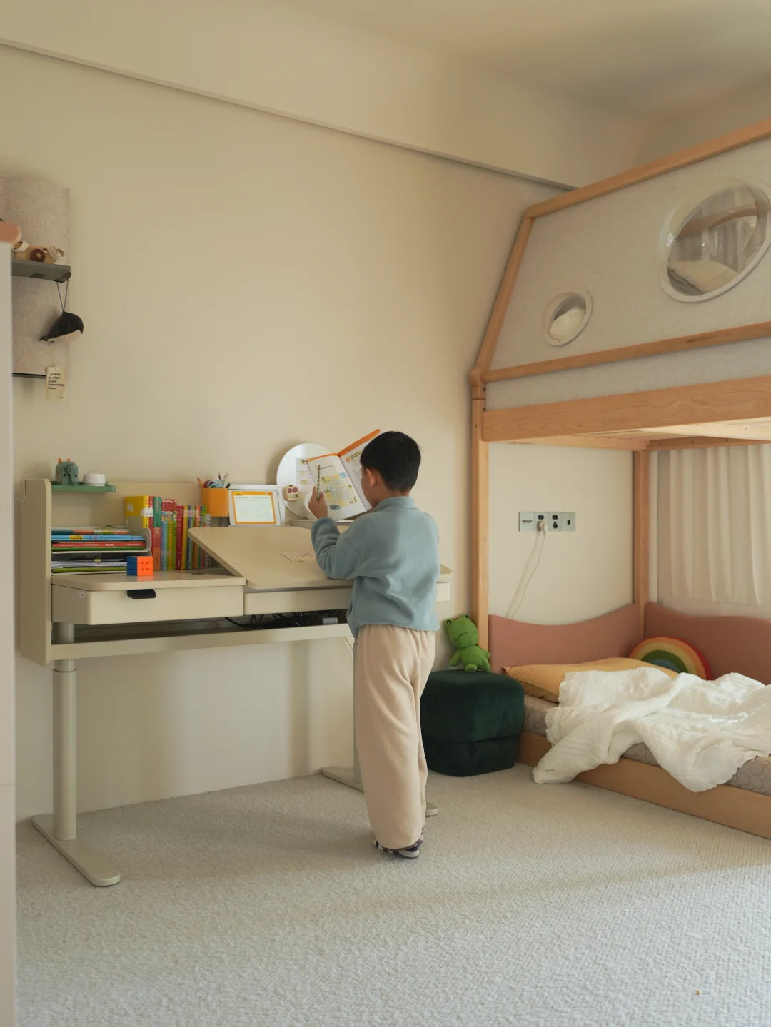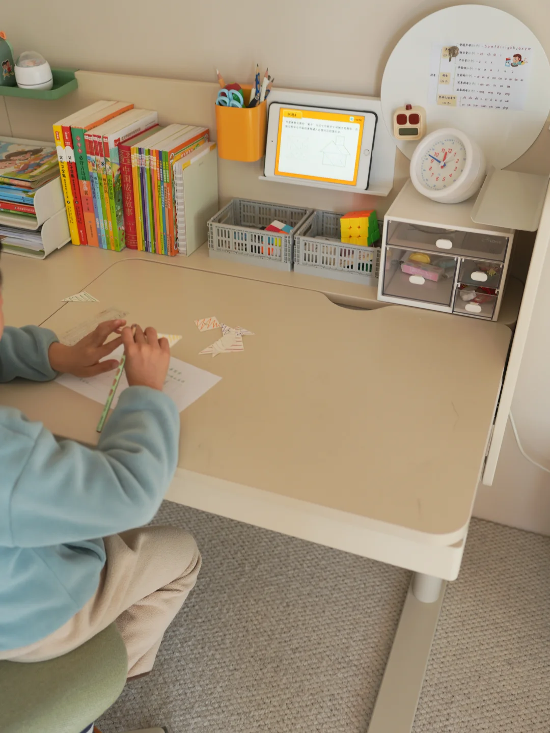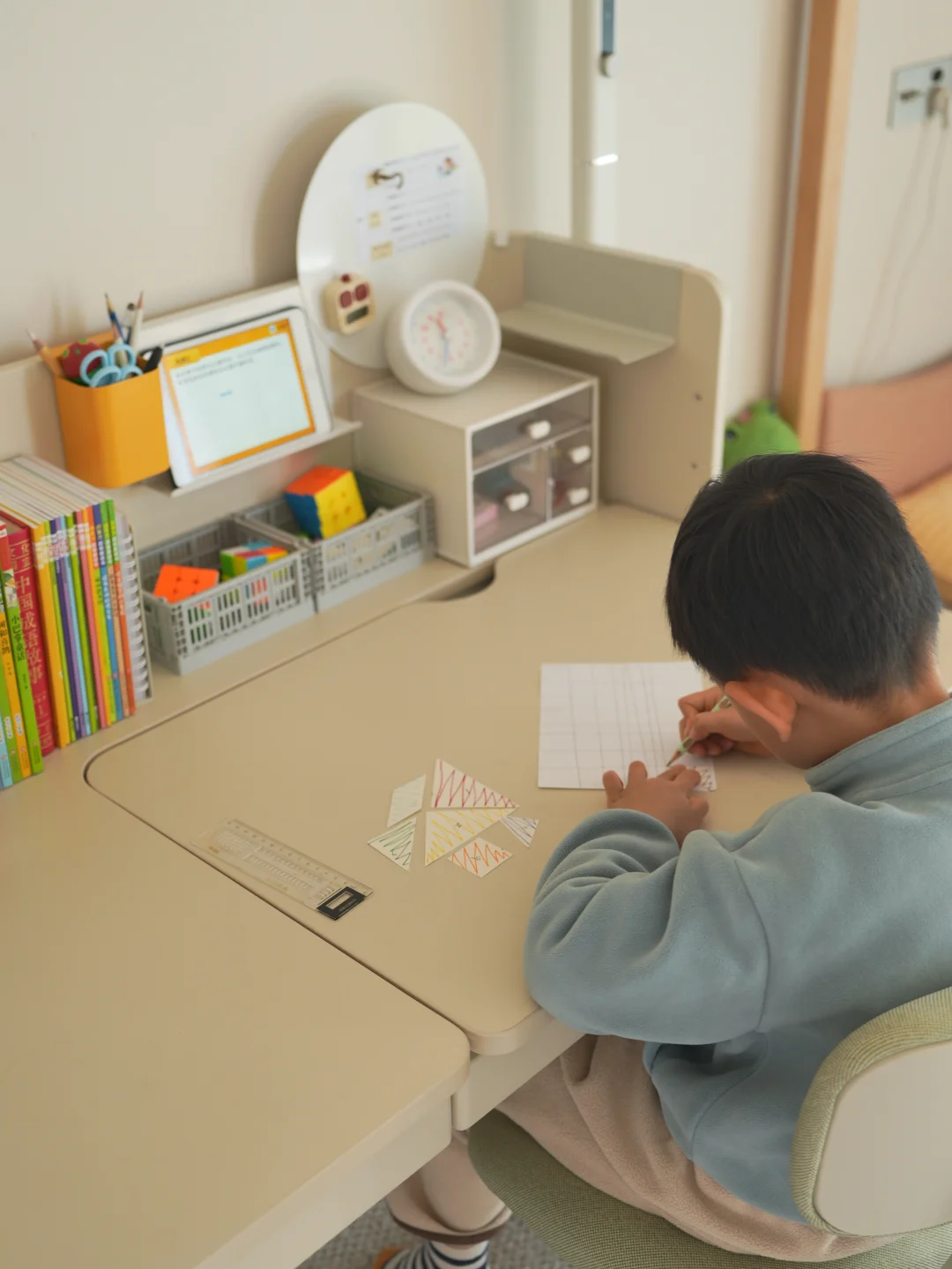 可升降的书桌椅,调整到刚好合适的高度,双脚自在落在地上,感觉这才是“属于”他的桌子。