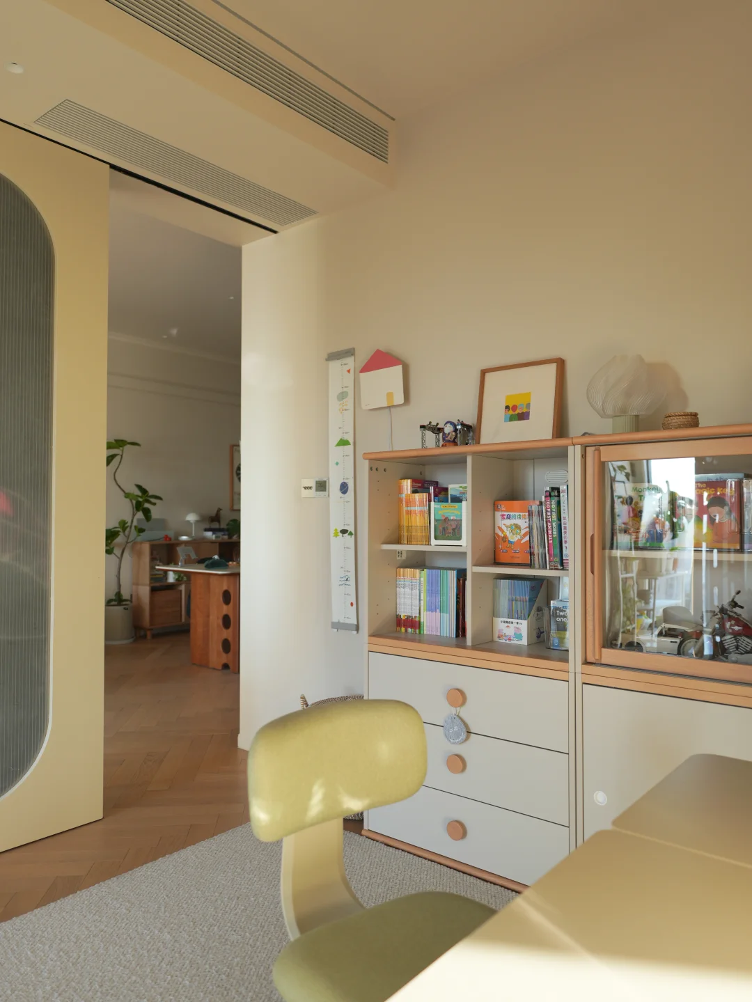 装修时孩子还小,我给儿童房开了两个移门,为的是在保留一间房的同时,在客厅也可以随时照看到他独自玩耍时的状态。