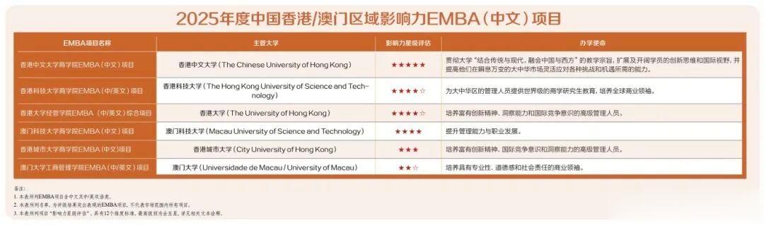 根据评级结果,入选今年最优项目的为六个(含EMBA中/英文项目)。其中,荣膺全5星评级的香港中文大学EMBA(中文),荣膺4.5星评级的香港科技大学EMBA(中/英文)和香港大学EMBA(中/英文)综合项目、荣膺4星评级的澳门科技大学EMBA(中文)。