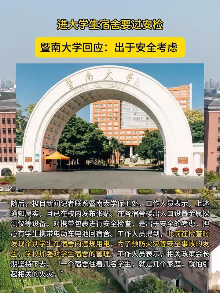 进大学生宿舍要过安检,暨南大学回应:出于安全考虑。 极目新闻。 11月29日,有网友在社交平台分享了一则《关于进一步加强学生宿舍消防安全管理的通知》,引发热议。该通知称:"为杜绝消防安全隐患,保障全体学生生命财产安全,自2025年12月1日,物业工作人员将在各宿舍楼出入口通过金属探测仪等设备对携带包裹进行安全检查,严禁携带电动车电池、管制刀具等危险品进入宿舍区域。"该通知的落款单位,为暨南大学保卫处和暨南大学学生处等部门。 随后,极目新闻记者联系暨南大学保卫处,工作人员表示,上述通知属实,且已在校内发布张贴。在各宿舍楼出入口设置金属探测仪等设备,对携带包裹进行安全检查,是出于安全的考虑,担心有学生携带电动车电池回宿舍。工作人员提到,此前在检查时发现个别学生在宿舍内违规用电,为了预防火灾等安全事故的发生,学校加强对学生宿舍的管理。工作人员表示,相关政策会长期坚持下去,"一个宿舍住着几名学生,就是几个家庭,就怕引起火灾。