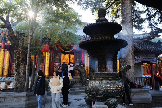五台山与浙江的普陀山、四川的峨眉山和安徽的九华山并称为中国四大佛教名山。 五台山是文殊菩萨的道场,也是我国唯一一个青庙(汉传佛教)和黄庙(藏传佛教)交相辉映的佛教道场。 五台山的五座主峰分别为东台望海峰、西台挂月峰、南台锦绣峰、北台叶斗峰、中台翠岩峰,海拔均超2800米,因五座峰顶开阔似平台,故称“五台”。 来到五台山,山间弥漫的云雾与古朴的寺庙相得益彰,仿佛踏入了超脱尘世的佛国仙境。显通寺历史悠久,寺内无梁殿的建筑巧夺天工,让人不禁感叹古人的智慧。塔院寺的大白塔圣洁而醒目,在日光下散发着柔和光芒,虔诚的信徒绕塔祈福,场面庄严肃穆。 登上菩萨顶,300多级台阶虽有些挑战,但登顶后,俯瞰台怀镇全景,红墙金瓦与绿树青山相互映衬,美不胜收。