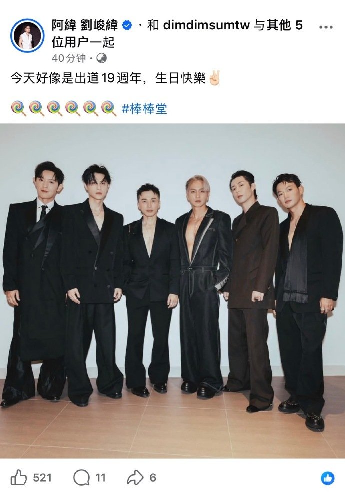 阿纬庆祝棒棒堂出道19周年 阿纬发文庆祝棒棒堂出道19周年,但应该是很难再看到六