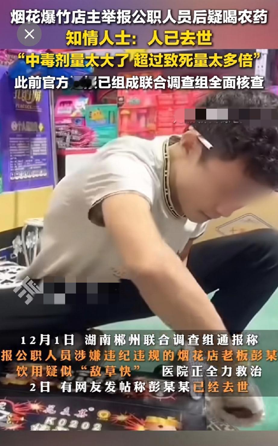 烟花爆竹店主疑举报公职人员后,服毒自杀,已身亡。 诶,看了店主最后发的视频,年纪轻轻的。 说是囤了很多货,但是许可证一直办不下来。 我不用看都知道,发生地一定不会是深圳,杭州这种营商环境好的城市。 我一看发生地,内陆三四线小城市,就明白了。 很多时候不仅仅要告诉他们不行,办不了。 而是要服务于人民群众,把人民群众的事情当做自己家的事情去解决。告诉人民群众到底该如何,该怎么做才能办好。