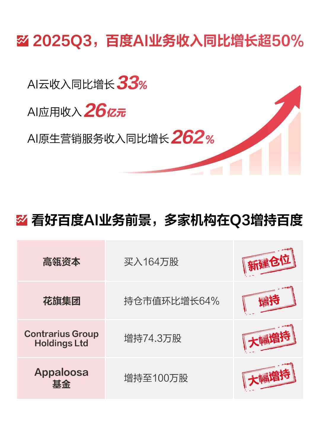 评估中国科技企业的逻辑,彻底变了! 在近三个交易日,百度港股连续上涨,市场对百度越来越看好。其中,像高瓴、花旗、Appaloosa这些投资界的大佬,都纷纷重仓买入百度股票。就说高瓴吧,直接买了164万股,按市值算超过2.1亿美元,这手笔可不小。 明面上是投资一家中国企业,但背后释放的信号不可谓不大。传统基于用户流量的互联网估值模型逐渐失效,现在资金不再只看月活用户,而是评估其AI模型能力、数据生态价值和B端变现效率。 百度就是一个非常典型的例子,企业在人工智能领域砸了那么多钱,现在开始看到了实实在在的效果。AI云在Q3收入同比增长33%,超65%的央企都和百度智能云达成合作,AI原生营销服务收入更是同比增长262%。 或许以前在市场看来,百度可能就是一家业务很广的互联网公司。不过到今天,情况完全不一样了,百度已经变成了一家拥有全栈AI能力的互联网企业,就是说从最底层的AI芯片,到中间的深度学习框架,再到最上面的大模型,以及各种上层应用,百度全都能自己研发、自己搞定。 而且百度这些财务数据变好并非短期的热闹,而是多年来在AI领域疯狂投入,好不容易才构建起来的技术护城河,所带来的效益。毕竟,在全球范围内,除了谷歌,就只有百度能做到从AI芯片(昆仑芯)、深度学习框架(飞桨)、大模型(文心)一直到上层应用,全链路都自己研发。 虽然前期布局的时候花了好多好多钱,成本特别高,但这也让百度有了超强的协同效应,抗风险能力也变强。就好比打仗的时候,别人只有一种武器,百度却有一套完整的装备,啥情况都能应对。 如今多家机构重仓百度或也只是一个缩影,背后是全球资金对中国资产的重新审视。要知道,在中国,AI不是空中楼阁,而是可持续发展不断赋能各行各业的强大生产力。这种在AI应用层的快速落地和庞大市场,无疑也为全球资本提供了更加具体的目标。