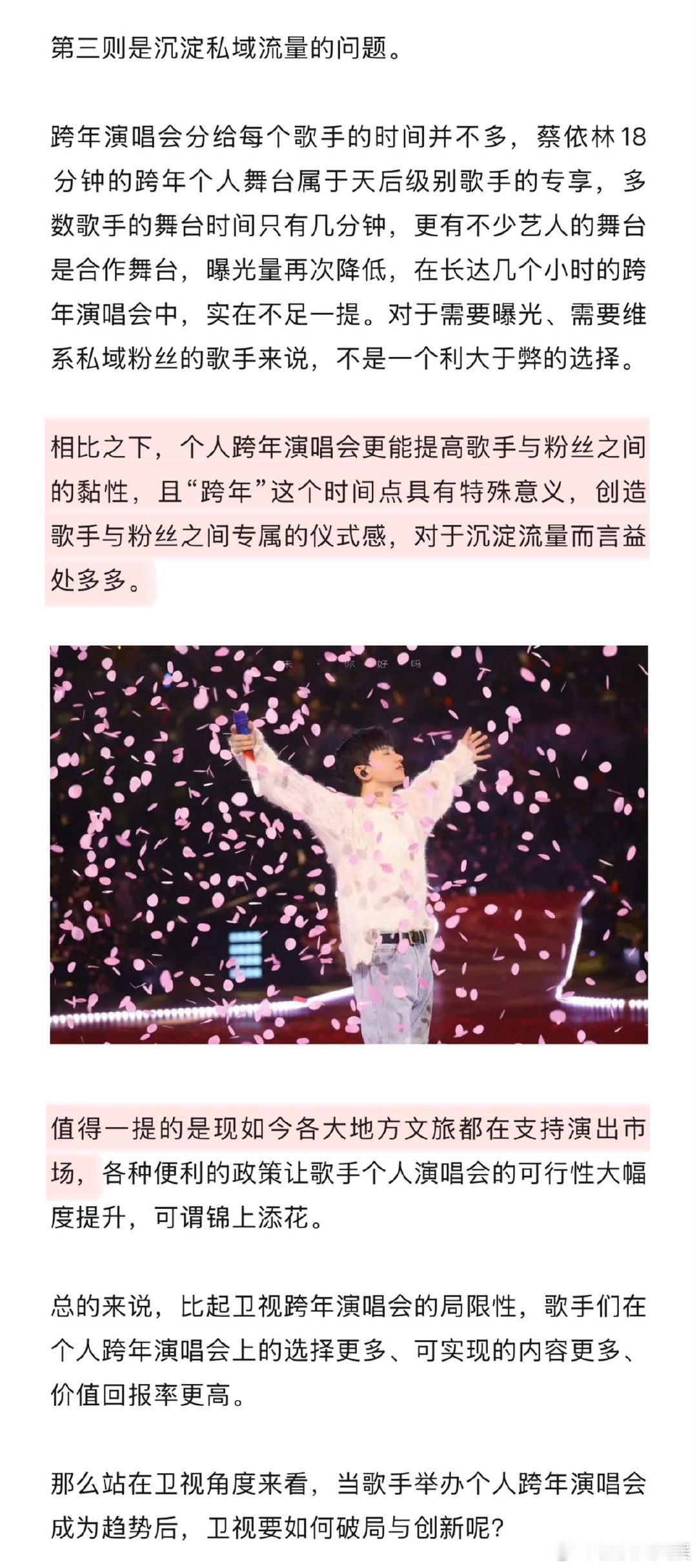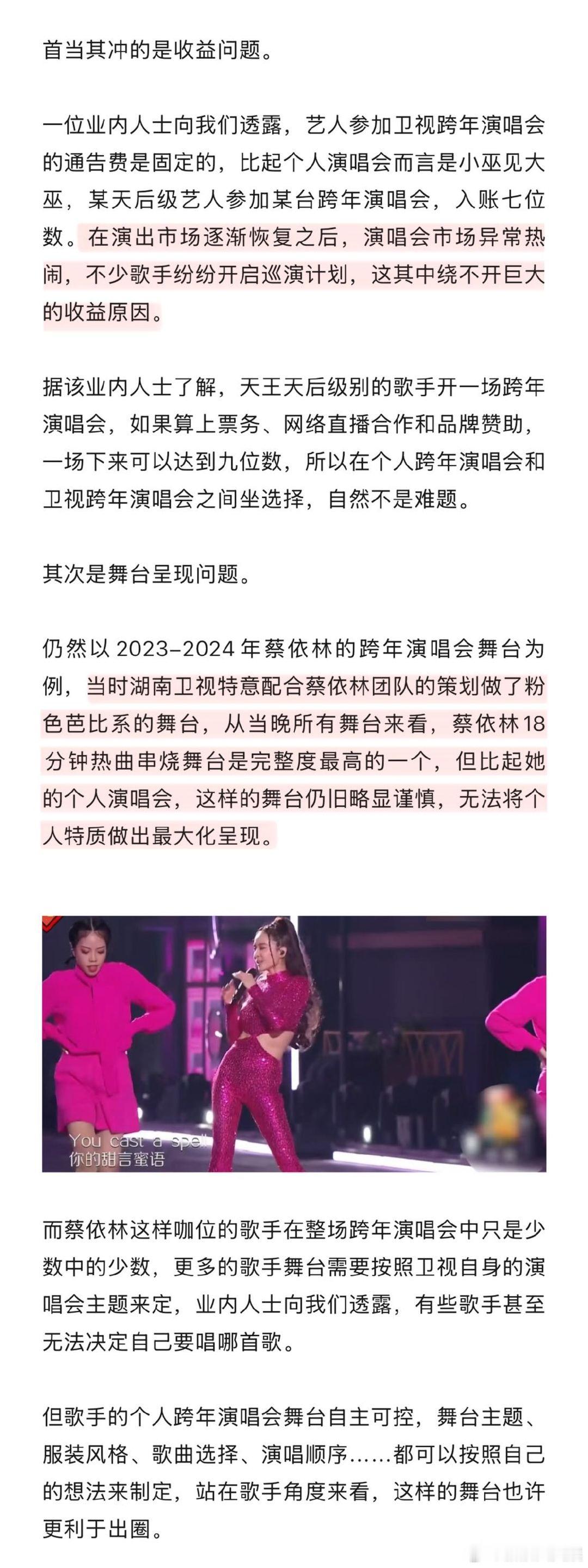 留给卫视跨年演唱会的歌手不多了今年的跨年演出好多人啊 业内人士透露,歌手选个人跨年演唱会而非卫视,核心是收益差距悬殊,此外还有卫视舞台受主题、歌曲选择限制等问题,个人场却能自主掌控所有细节,还能沉淀私域流量,歌手选择个人跨年场的原因不难从中得出。