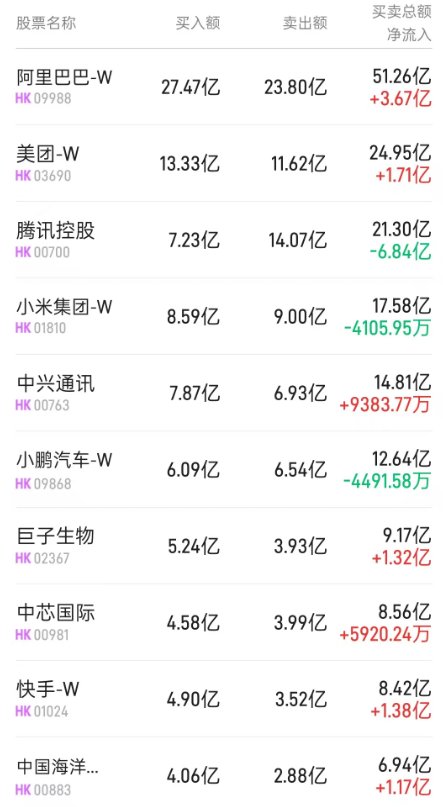 此外,中海油(00883)、中兴通讯(00763)、小鹏汽车-W(09868)分别获净买入3.49亿、9438万、465万港元。而腾讯(00700)、中国人寿(02628)分别遭净卖出3.81亿、1642万港元。