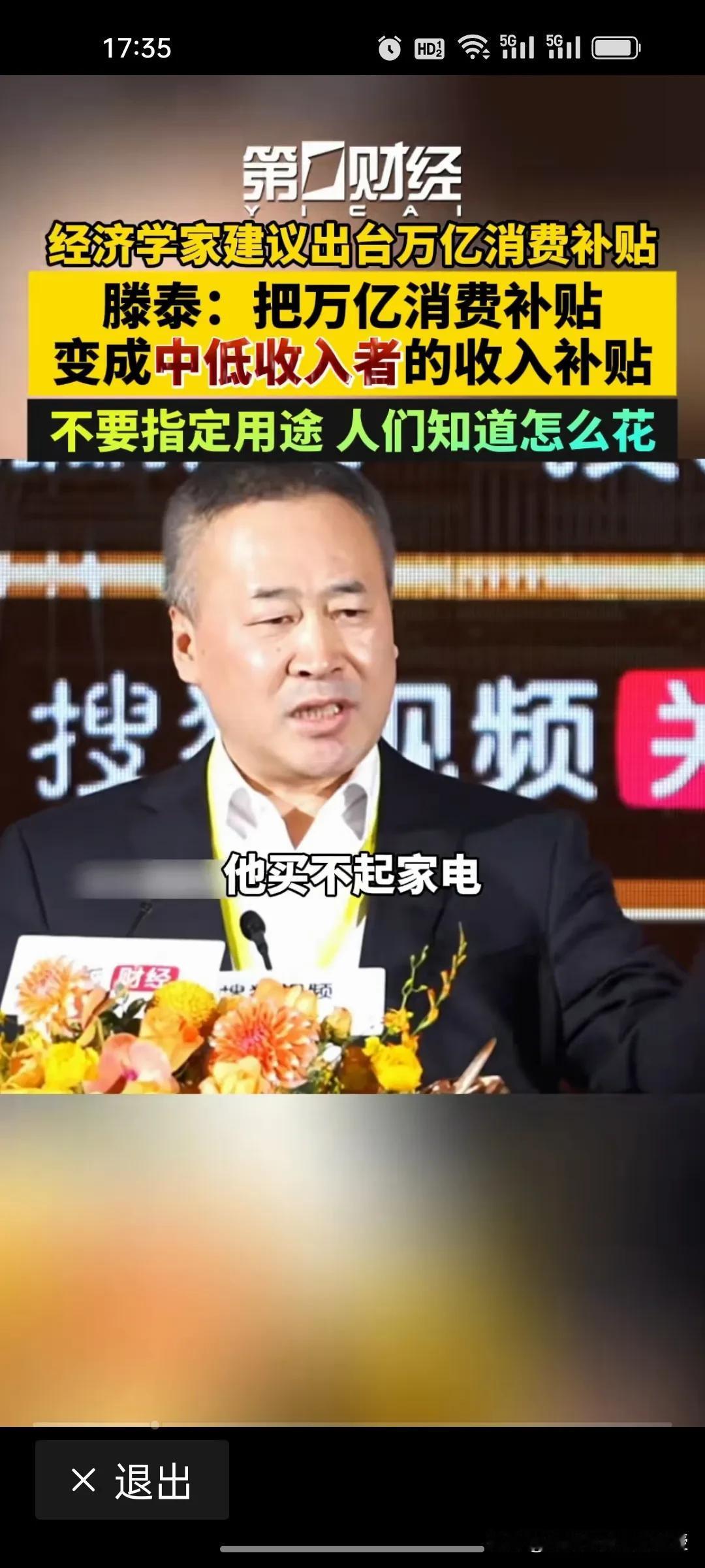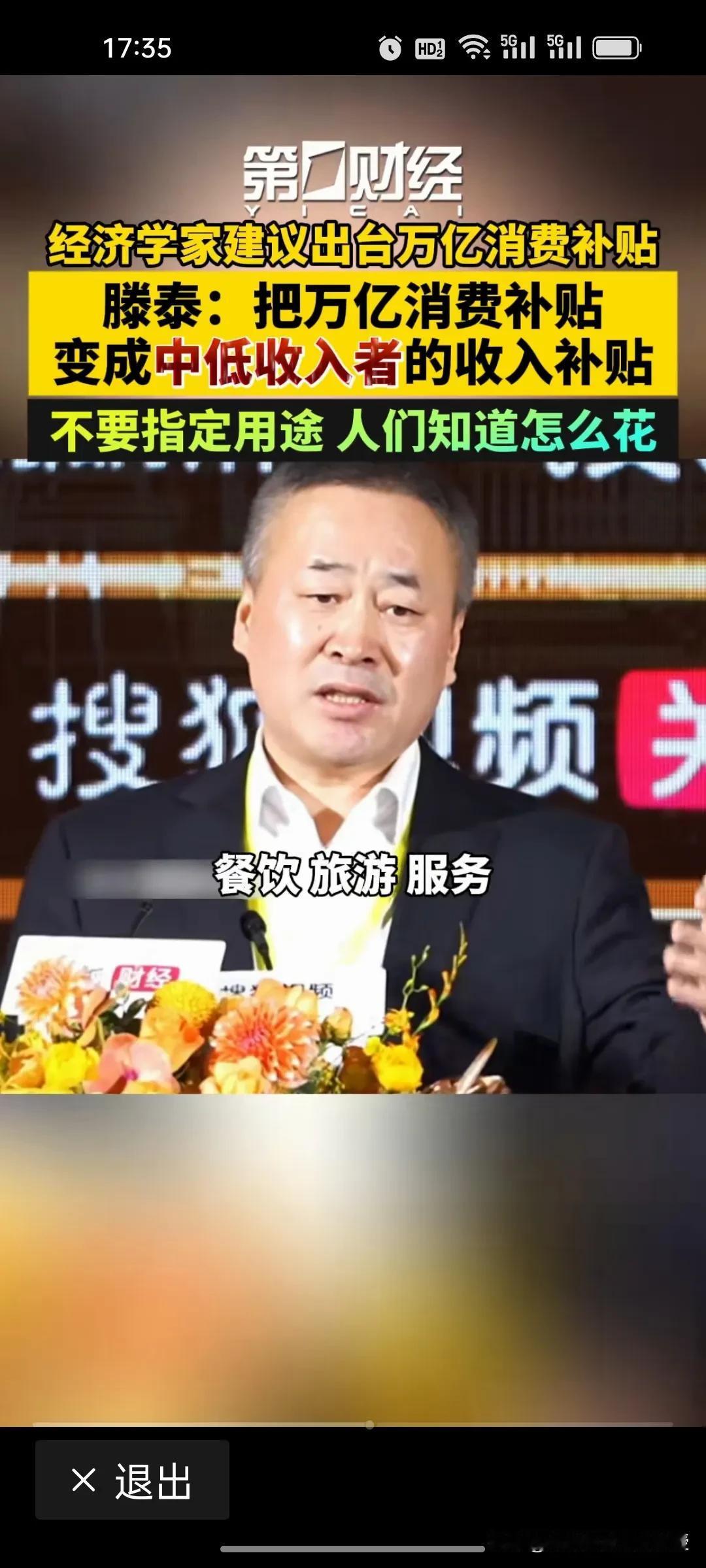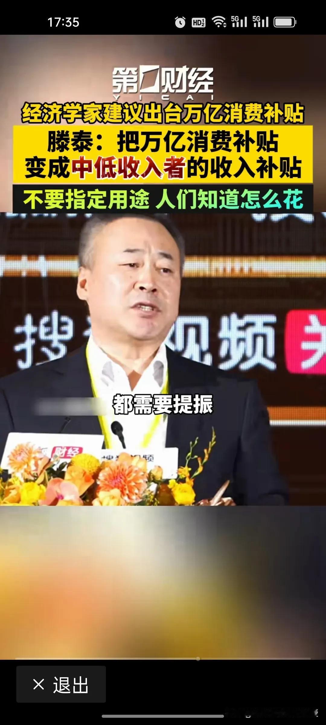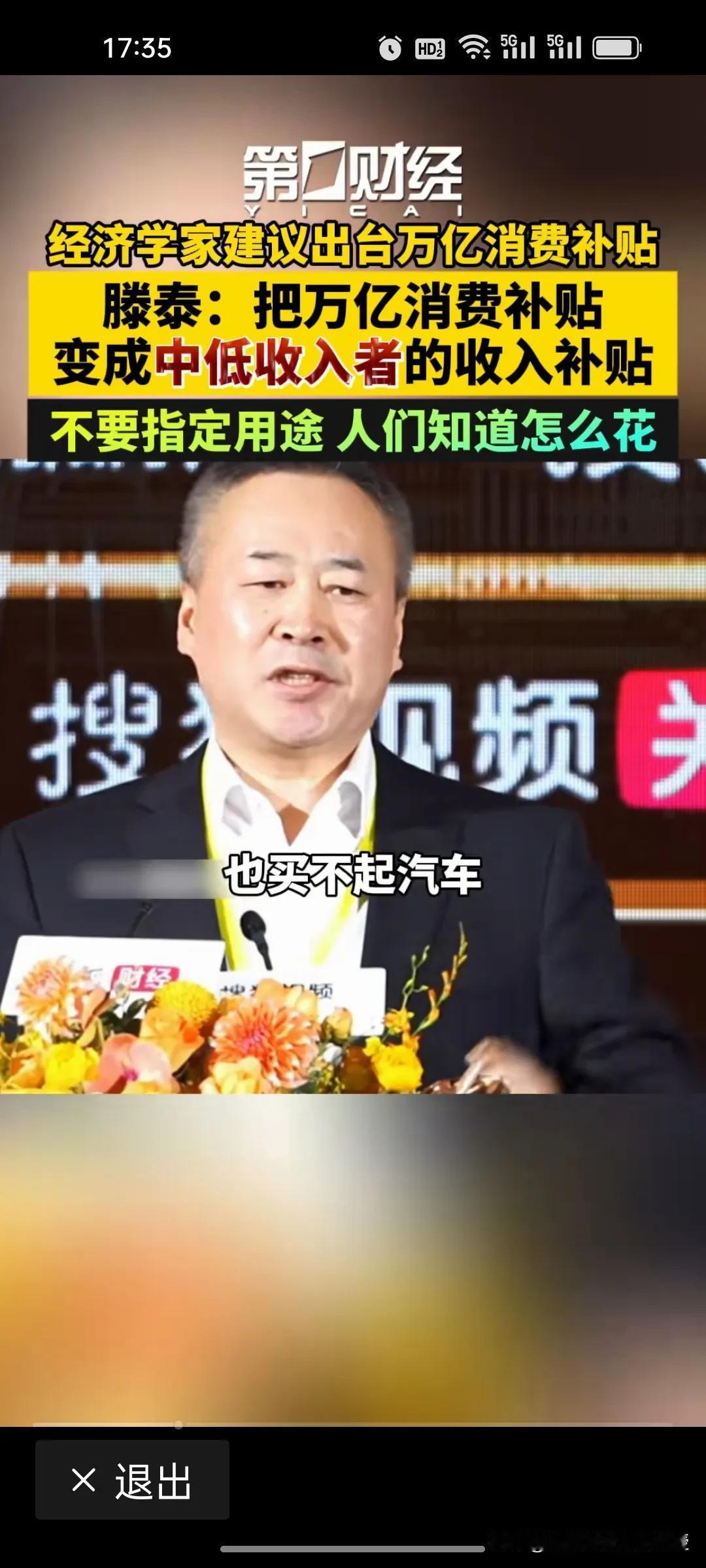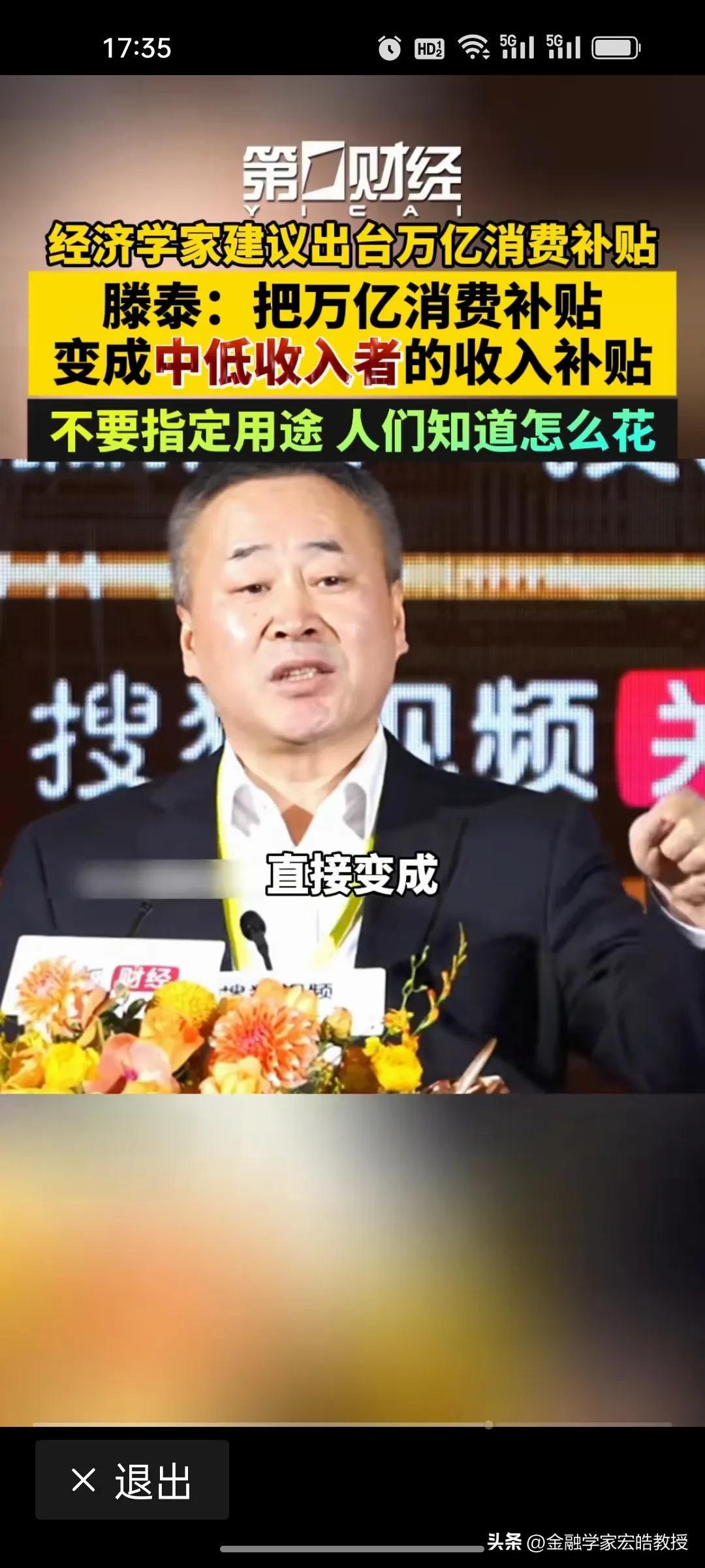 经济学家滕泰给提振消费支招,建议出台万亿消费补贴,要变成中低收入者大收入补贴,不要指定买家电买汽车,大家知道怎么花。一万亿补贴能带来三万亿需求增长,带动2-3个电的GDP增速。 比如,今年中央已经发了3000亿的消费补贴。带动相关商品消费额超过2万亿。未来要形成“补贴 - 消费 - 增长 - 收入 - 再消费”的良性循环,继续补贴是少不了的。 滕泰说不限用途的消费券,确实更加实用,满足了各方面的消费需求,不再仅限于电子产品,家电和汽车,也能让其他消费品行业从补贴中获益。 另外,要扩大消费还有两个重要的关键点,一个就是增加工资收入,大家收入提高,自然消费动能就会释放。二是增加财产性收入,现在买房子不能增值,很多人当年买房在高位,现在房价跌了,还要继续还房贷,自然提不起消费兴趣,如果能在理财市场能赚到钱,不管买股票还是买基金,都有钱赚,能覆盖房贷车贷,那么老百姓腰包鼓了自然都会去消费。