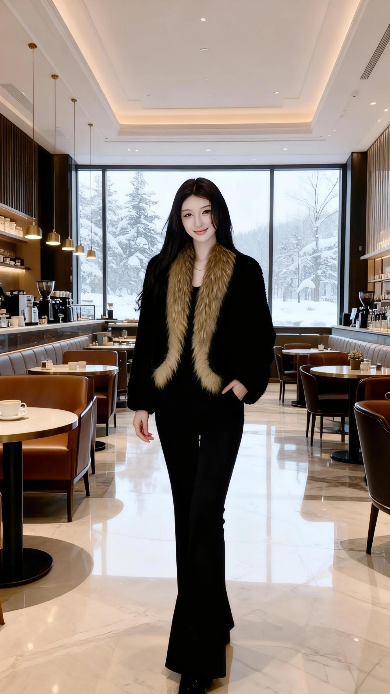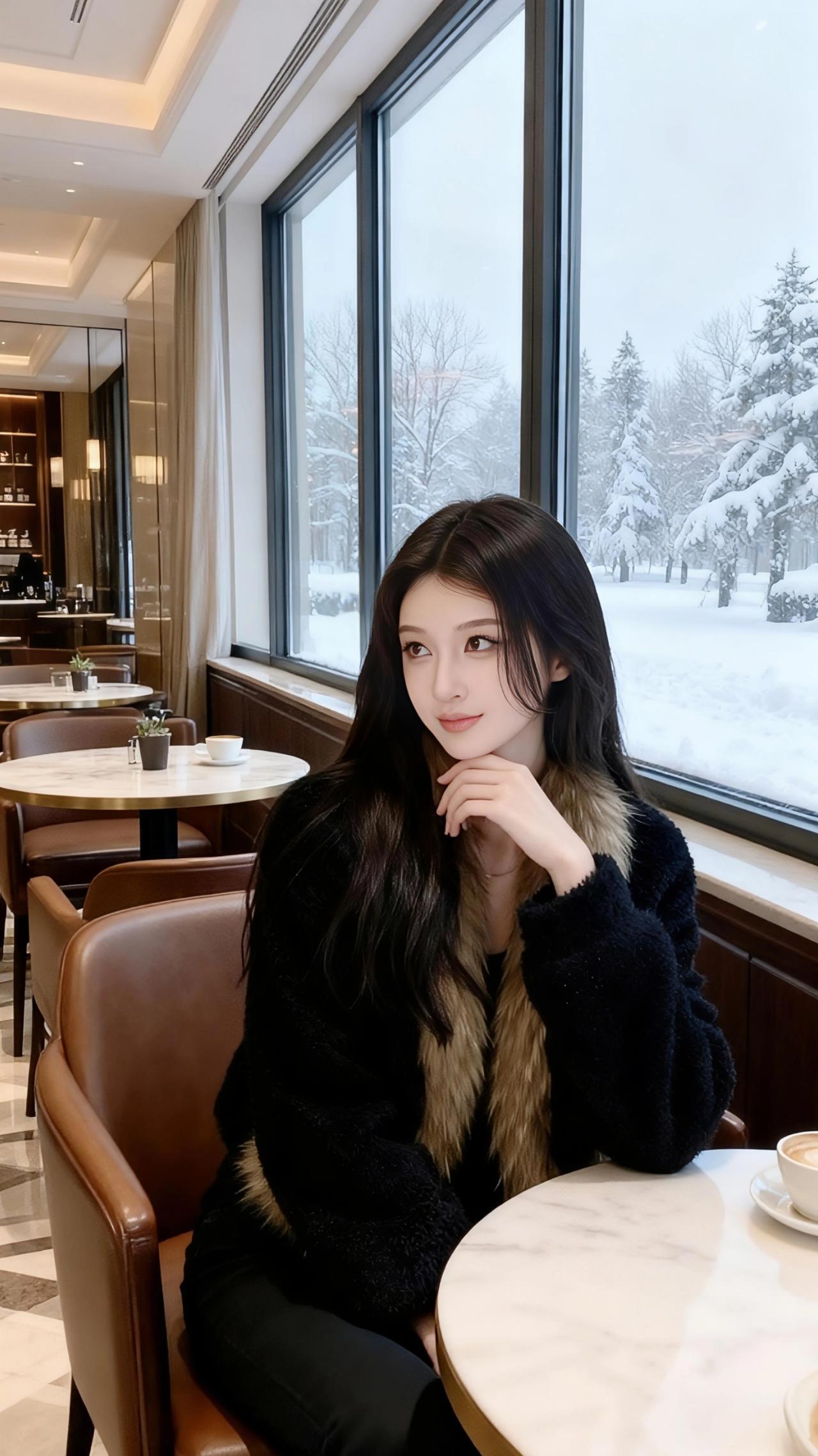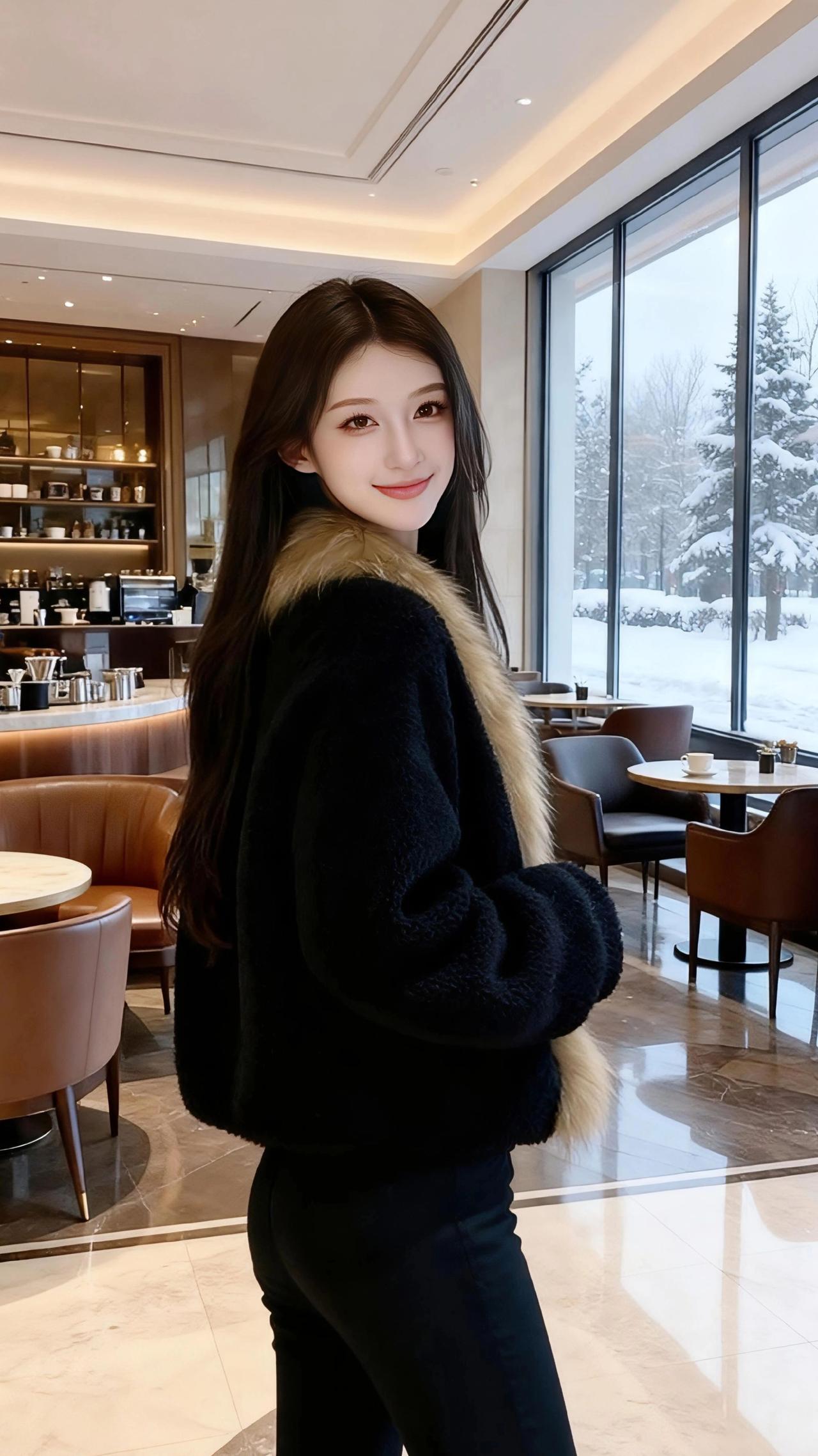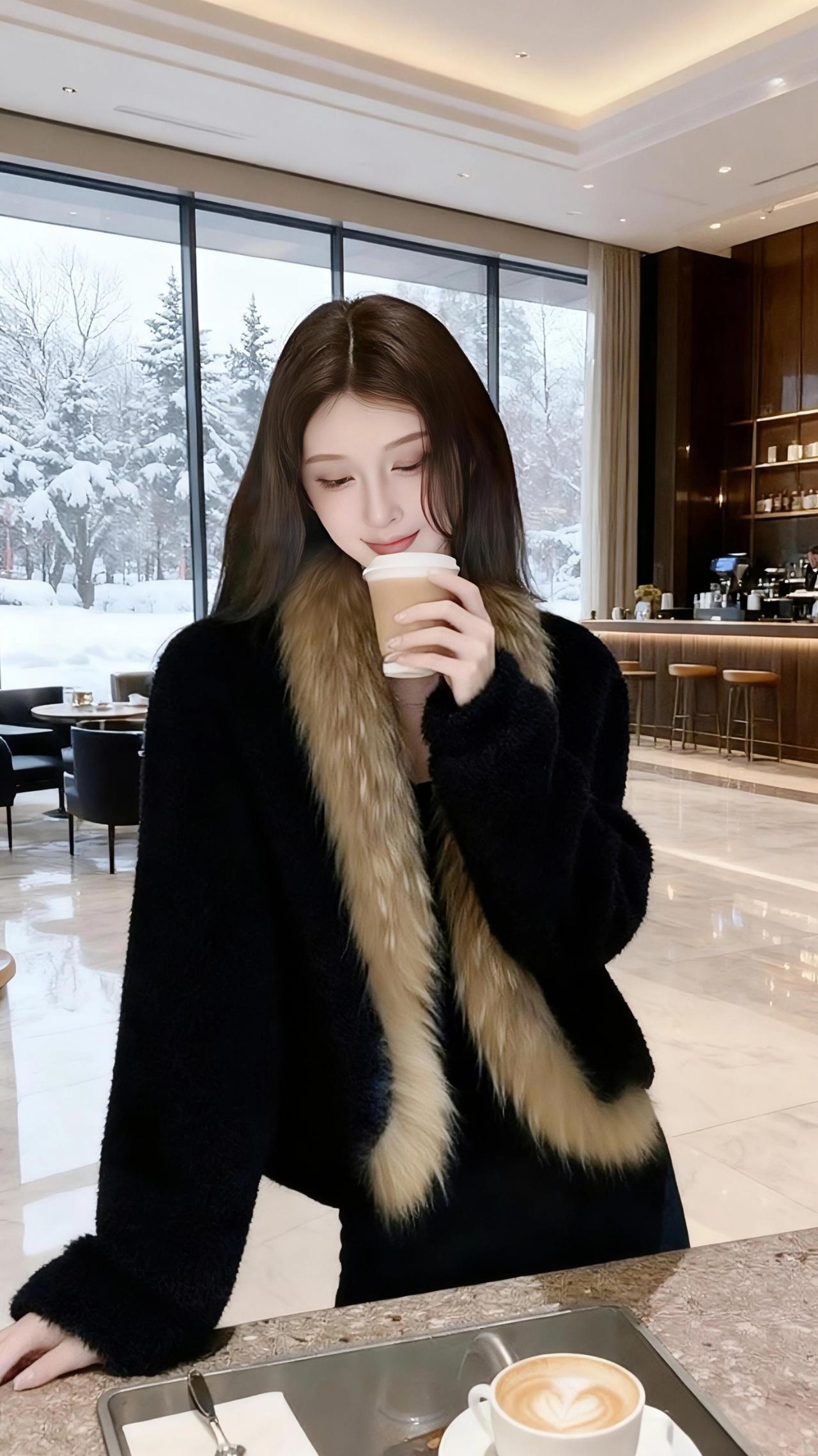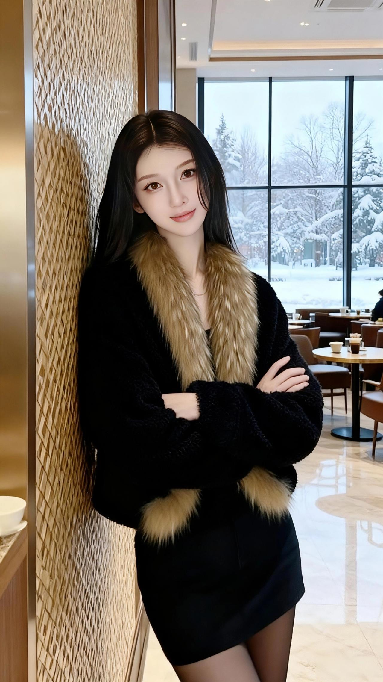 雪落进玻璃窗的褶皱里,把咖啡馆的暖光浸得软了。她裹着那袭黑绒,像裹了半盏深夜的暗,唯有颈间垂落的毛领,是松针上未融的霜色,泛着浅金的暖。 指尖碰着咖啡杯沿时,雾汽漫过睫羽——窗外的雪是静止的,落在杉树顶,落在长椅的木纹里,连空气都慢成了奶泡的纹路。她偏头时,长发擦过毛领的软,像风掠过雪堆,悄无声息,却让整个冬都柔了下来。 后来她倚着墙,臂弯叠起的弧度里,藏着半室的暖香与半窗的白。雪还在下,落在玻璃上,也落在她眼尾的光里,成了这季最软的诗。 名媛气质 高级感穿搭 秋冬穿搭穿搭