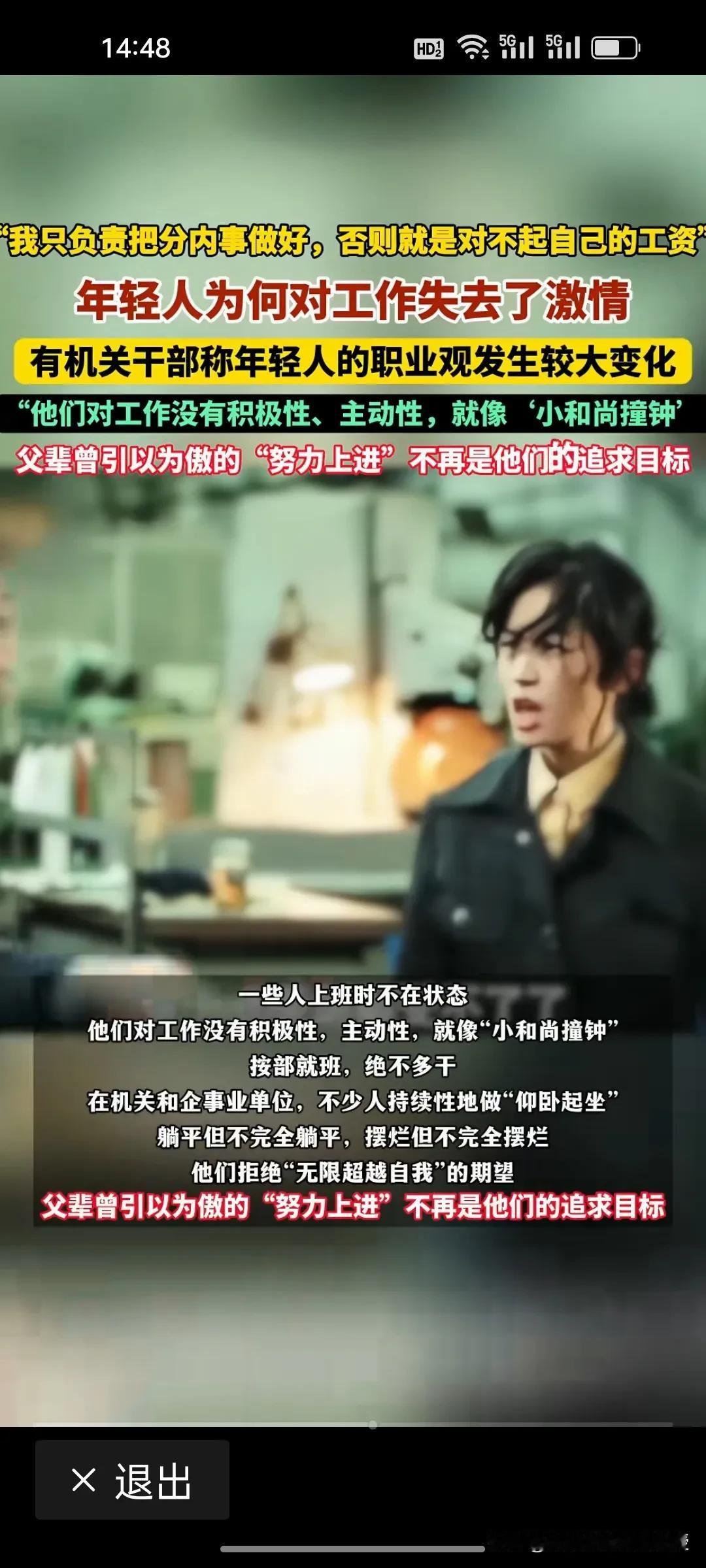 图一和图二合起来看就能解释《半月谈》提出的问题,“为什么现在年轻人对工作失去了激情”? 答案就是,他们已经把所有的激情全放在大一就开始的漫漫长路考公准备上,考公上岸是他们的终极目标,而不是人生工作旅程的开始,因此,千军万马挤独木桥达成目标上岗后就表现得异常清醒,绝不在工作上内耗浪费青春,按部就班,绝不多干。 有西部一位机关干部就说,现在年轻人的职业观已经发生了很大的变化,机关和企事业单位“仰卧起坐”的青年不在少数。曾经我们的父辈都说踏上工作岗位要积极肯干,那个时代的现象已经一去不复返了。
