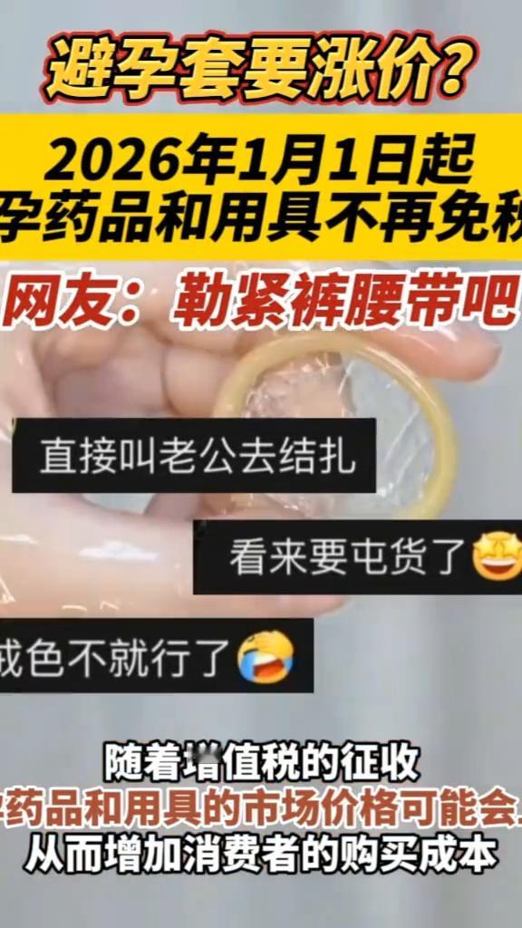 避孕套要涨价?2026年1月1日起,孕药品和用具不再免和。 网友:勒紧裤腰带吧。自2026年1月1日起,避孕药品和用具将依法征收增值税,不再享受免征增值税的优惠政策。免征增值税政策的取消将对避孕药品和用具的生产销售企业产生直接影响。随着增值税的征收,药品和用具的市场价格可能会增加,从而增加消费者的购买成本。 直接叫老公去结扎,看来要屯货了,成色不就行了。