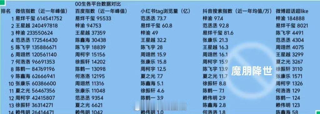 00生近一年各平台数据对比: 看下来感觉易烊千玺很稳,梓渝窜得很快。有同感吗?