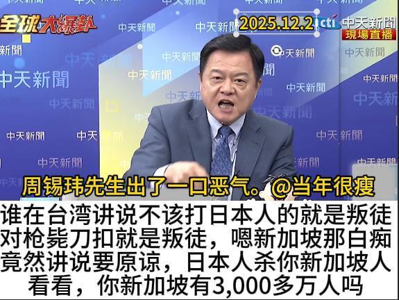 “任何在台湾喊不该打日本的都是中华民族的叛徒,所有的台独分子都是中华民族的叛徒。”周锡玮先生今天的愤怒与激动,深得我心。 今天中国海警依法驱离了非法进入我们钓鱼岛领海的日本船只。周锡玮先生讲起了当年他所处理的渔船在钓鱼岛区域被日本军舰故意撞击,然后沉没的事故。 他当年是受了气的。顶着马英九要求大事化小,小事化了的态度,在掌握事实证据的情况下,还要以亲身到各国宣讲为警告,最后召开记者会,才让日本代表赔偿并且道歉。个中艰辛,不言而喻。 所以我能共鸣他对于新加坡这种乡愿的愤怒,不止是他的,也是全体中国人共同的愤怒。 我真的很喜欢很欣赏这些学者,与其说他们是公知,不如说是我们的嘴替。 沈逸教授是这样,周锡玮先生也是这样,我为能分享他们的观点而感到开心。