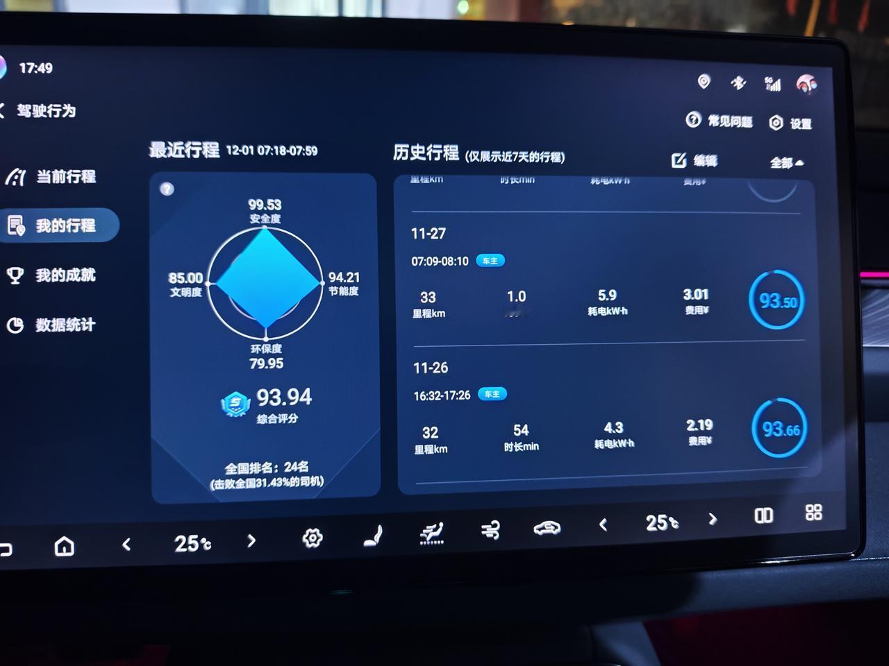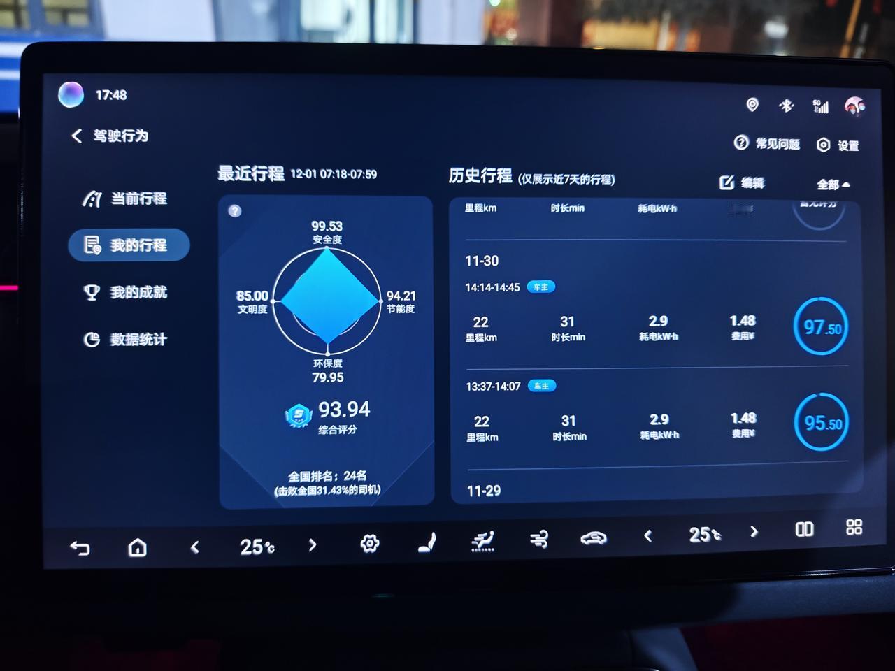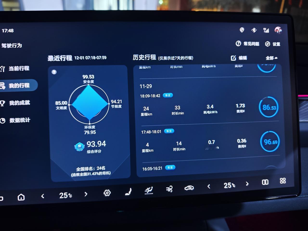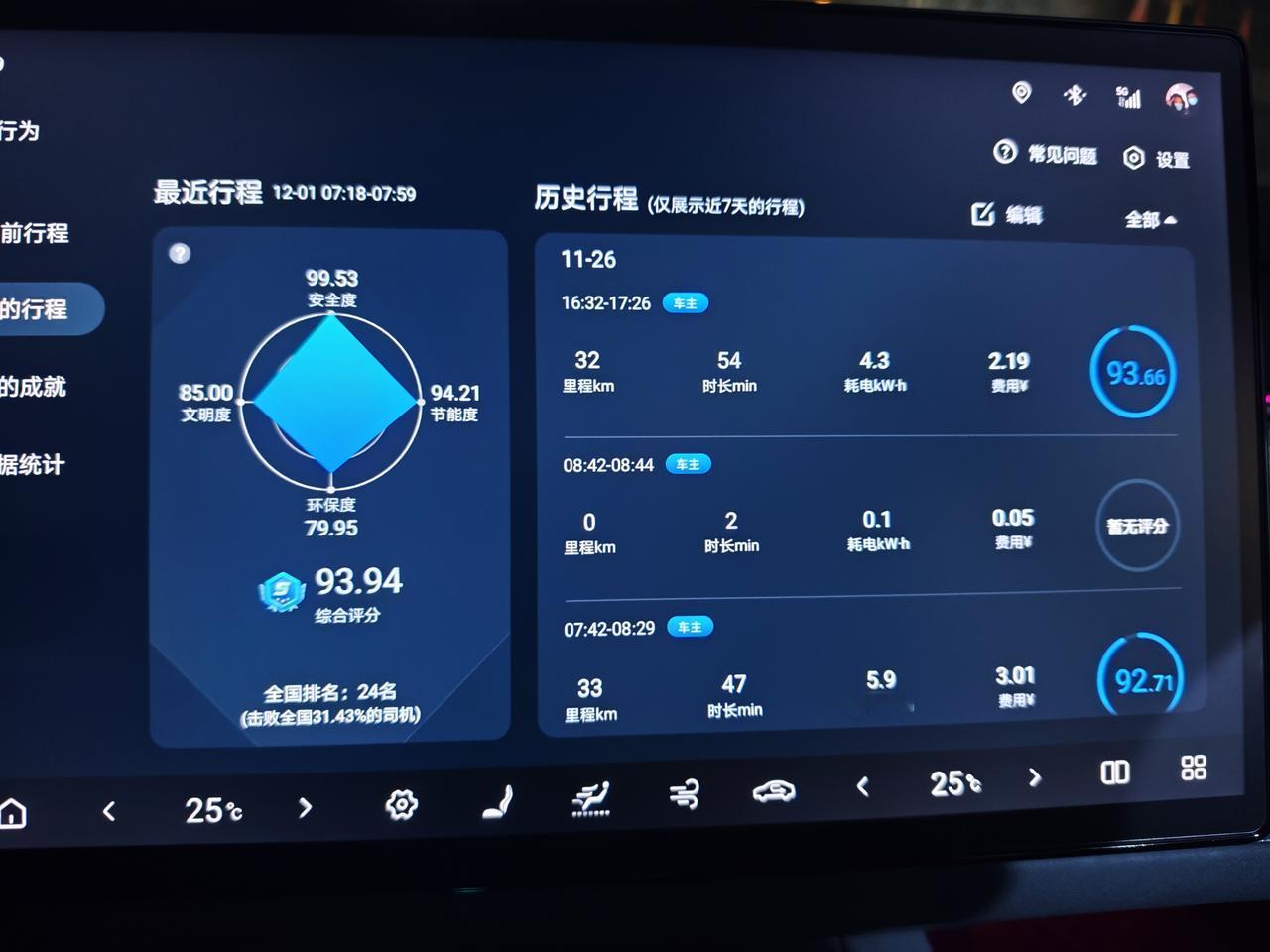 最近几天上下班几乎都在零下了,今天下午下班到家一看空气温度都只有-2℃了,早上温度更低,甚至能到-7℃,低温对续航影响确实不小。 ●车辆信息🚗🚗 海豹06gt505plus非智驾版本,搭载是比亚迪磷酸铁锂短刀电池,电池容量59.52kwh标定续航505km,后驱单电机马力215匹,最大扭矩310n.m。车长4630mm,轴距2820mm,空车质量1850kg。 ●汽车设置⚙️⚙️ iP地址🗺️: 天津市,平原地区。 动能回收模式⚡:标准模式。 驾驶模式 :舒适模式 空调设置❄️:25℃暖风+自动档,一般早上全程都会开着,下午刚上车会开,暖和了就不开了。 静止胎压:2.5bar ●行程记录🛣️🛣️ ①11月26日,星期三,当天天气,阴-4~7℃,北风3级,当天通勤里程32+33=65km,通勤能耗4.3+5.9=10.2kW⋅h。 ②11月27日,星期四,当天天气,多云-2~7℃,西北风4级。当天通勤里程33km,通勤能耗5.9kW⋅h。 ③11月28日,星期五,当天天气,阴-3~7℃,东风2级,当天通勤里程33km,通勤能耗5kW⋅h。 ④11月29日,星期六,当天天气,晴-3~13℃,西北风3级,当天通勤里程24+4+27=55km,通勤能耗3.4+0.7+5.5=9.6kW⋅h。 ⑤11月30日,星期日,当天天气,晴-1~11℃,西北风3级,当天通勤里程22+22=44km,通勤能耗2.9+2.9=5.8kW⋅h。 ●里程汇总💹💹 ①通勤总里程:65+33+33+55+44=230km ②通勤总能耗:10.2+5.9+5+9.6+5.8=36.5kW⋅h ③通勤费用,天津谷底电价是0.3元/kW⋅h,所以总消费是36.5×0.3=11块钱,充电有15%的损耗,所以电费是11×1.15=12.65元,相当于百公里12.65/2.3=5.5,百公里也就五块五。 ④最后算一下续航达成率。36.5/59.52×505=310,230/310=74%。 ●总结一下 ①在全部零下的温度中,还开着暖风的情况下还有74%的续航达成率,这个表现我认为还是不错的,不过现在还不是北方最冷的时候。 ②冬天基本上温度底5℃,胎压也会降差不多也会降5-10kpa个点数,我这几天都懒得自己补胎压了,我直接把静止胎压打到了2.6bar,早上也就只剩下2.5bar左右,过几天再降温说不定还得补。 ③我有时候怀疑表显的电量百分比准不准,我静止不动开一个小时电耗才1个,但是开车的时候同样的路程下,半个小时就要比不开空调高2个点。 【请到“懂车帝APP”查看投票】