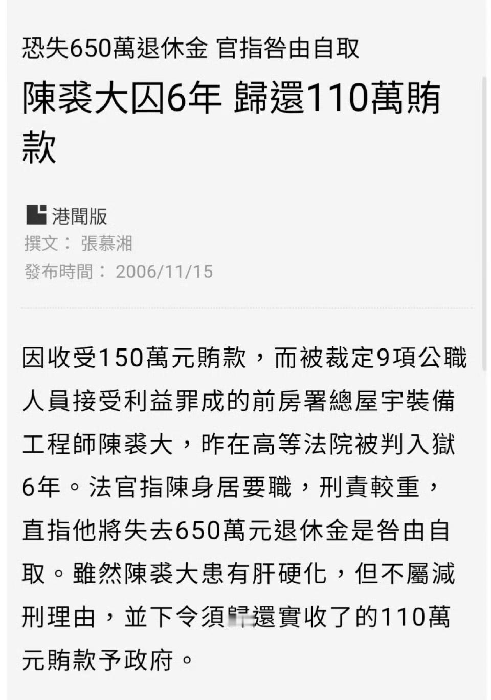 香港工程贪污不是一天两天,受贿的有屋苑的法团,也有港府的公职人员。 陈奕迅的父亲曾经在港府房署要职,也因受贿入狱。