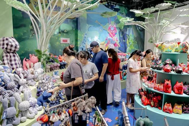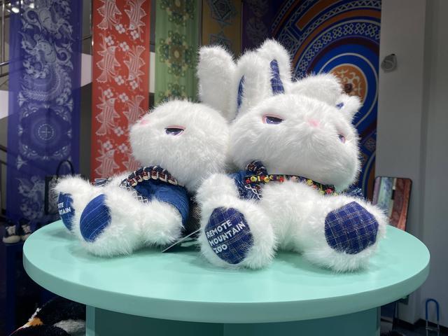 在“深山动物园”分区,各种印有非遗元素的动物造型的玩偶依次摆开,非遗含量爆表。店员杨秋告诉记者:“‘AI花小兔’的雪白色玩偶是我们店的销量爆款,它的双耳绣有侗锦经典的‘万’字纹,游客还可以通过智能语音和它进行实时对话。”