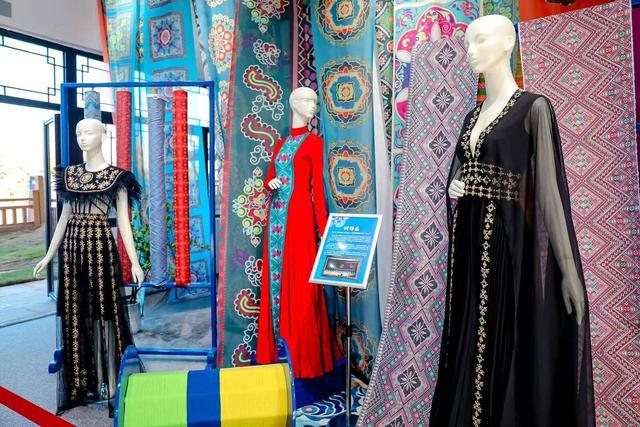 集市中央的高定礼服展区就是侗锦与现代时尚结合的具象化产物,高定礼服的图纹就采用了侗锦纹样,黑色礼服神秘优雅,深V造型,利落又大胆,袖子薄如蝉翼,加上侗锦几何图腾纹路作点缀,质感拉满。黄色无袖礼服的裙摆将非遗肌理融入现代剪裁里,衣服上绣满了的侗锦花鸟图案寓意吉祥如意。