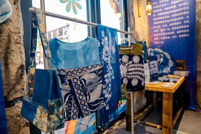 (图为蓝印花布印染的衣服、包包、围巾等。怀化日报全媒体记者罗单摄)