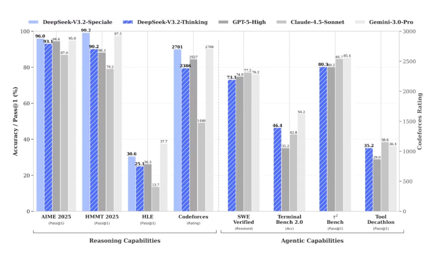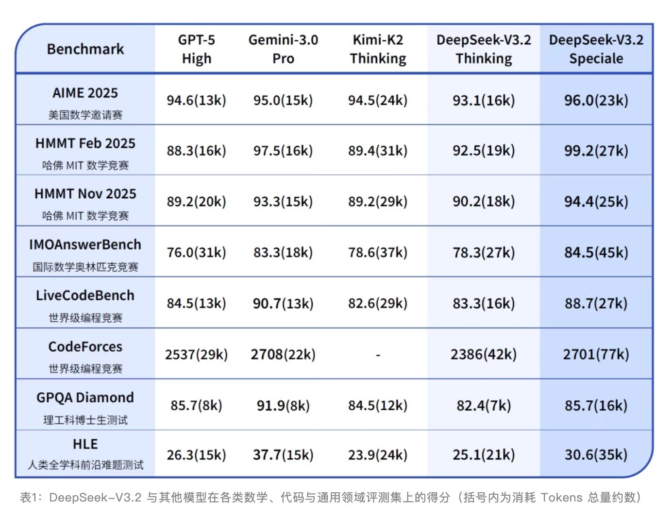 【 DeepSeek V3.2正式发布:推理达GPT-5水平,智能体评测中开源模型最高水平】 (澎湃新闻·10%公司 2025-12-01 20:20 ) 国产大模型风向标DeepSeek再发重磅新模型:重点强化智能体能力,并且融入思考和推理过程。 12月1日,DeepSeek同时发布两个正式版模型:DeepSeek-V3.2 和 DeepSeek-V3.2-Speciale,官方网页端、App和API均已更新为正式版 DeepSeek-V3.2,Speciale版本目前仅以临时API服务形式开放,以供社区评测与研究。 据介绍,DeepSeek-V3.2的目标是平衡推理能力与输出长度,适合日常使用,例如问答场景和通用Agent(智能体)任务场景。在公开的推理类Benchmark测试中,DeepSeek-V3.2达到GPT-5的水平,仅略低于Gemini-3.0-Pro;相比Kimi-K2-Thinking,V3.2的输出长度大幅降低,显著减少计算开销与用户等待时间。 据DeepSeek方面介绍,DeepSeek-V3.2-Speciale 的目标是将开源模型的推理能力推向极致,V3.2-Speciale是DeepSeek-V3.2长思考增强版,同时结合DeepSeek-Math-V2定理证明能力。 DeepSeek-V3.2具备指令跟随、数学证明与逻辑验证能力,在主流推理基准测试上的性能表现媲美Gemini-3.0-Pro。 不同于过往版本在思考模式下无法调用工具的局限,DeepSeek-V3.2是首个将思考融入工具使用的模型。同时支持思考模式与非思考模式的工具调用,目前提出一种大规模Agent训练数据合成方法,DeepSeek-V3.2 模型在智能体评测中达到当前开源模型的最高水平,大幅缩小开源模型与闭源模型的差距。 值得说明的是,V3.2并没有针对这些测试集的工具进行特殊训练,所以V3.2在真实应用场景中能够展现出较强的泛化性。 在评测和成绩方面,DeepSeek-V3.2-Speciale模型获得IMO 2025(国际数学奥林匹克)、CMO 2025(中国数学奥林匹克)、ICPC World Finals 2025(国际大学生程序设计竞赛全球总决赛)及IOI 2025(国际信息学奥林匹克)金牌。其中,ICPC与IOI成绩分别达到人类选手第二名与第十名的水平。 值得注意的是,DeepSeek指出,在高度复杂任务上,Speciale模型大幅优于标准版本,但消耗的Tokens也显著更多,成本更高。目前,DeepSeek-V3.2-Speciale仅供研究使用,不支持工具调用,暂未针对日常对话与写作任务进行专项优化。 DeepSeek是当之无愧的大模型风向标,一举一动都受到行业整体关注。最近网易有道词典发布2025年度词汇——“deepseek”以 8672940次年度搜索量成功当选。据有道词典负责人介绍,“deepseek”在词典内部的搜索曲线呈现明显的爆发式特征,从年初因“低成本”突破算力封锁起,几乎每个重要进展都会带动搜索量上涨。 DeepSeek V3.2正式发布:推理达GPT-5水平,智能体评测中开源模型最高水平