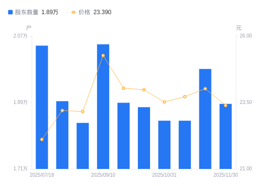 日期A股户数(户)流通A股户均持股数(股)户均持股市值(万元)2025-11-30188653121.127.302025-11-20198112972.097.142025-11-10184063198.967.592025-10-31184063198.967.522025-10-10187743136.257.522025-09-30188923116.667.492025-09-10204792875.147.272025-08-20183473209.247.432025-08-10189373109.267.212025-07-18204412880.496.37