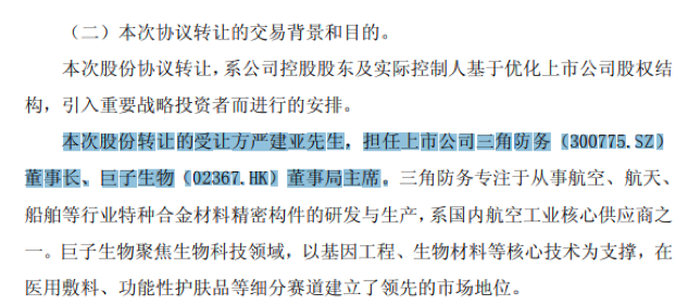 就严建亚原有的产业来看,三角防务专注于从事航空、航天、船舶等行业特种合金材料精密构件的研发与生产,系国内航空工业核心供应商之一。巨子生物聚焦生物科技领域,以基因工程、生物材料等核心技术为支撑,在医用敷料、功能性护肤品等细分赛道建立了领先的市场地位。