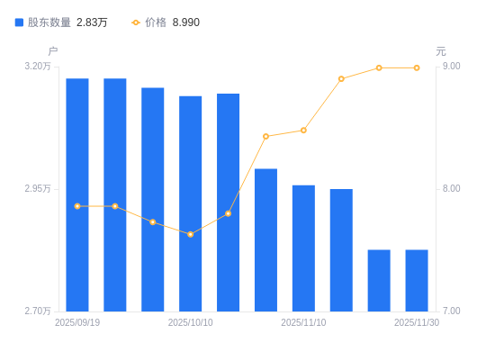 日期A股户数(户)流通A股户均持股数(股)户均持股市值(万元)2025-11-302826114711.3713.232025-11-282826114711.3713.232025-11-202950014093.5012.542025-11-102958014055.3811.922025-10-312991513897.9811.722025-10-203145013219.6610.312025-10-103139813241.5510.102025-09-303156613171.0810.182025-09-203175713091.8610.292025-09-193175713091.8610.29