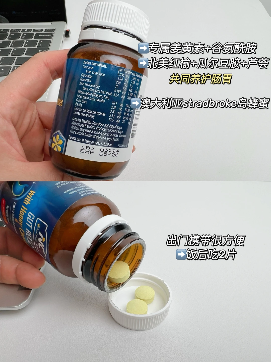 它还有一款NC蜂蜜养胃咀嚼片,也是复合养胃配方,姜黄素、谷氨酰胺这些也都有,里面还加了澳大利亚stradbroke岛蜂蜜。
