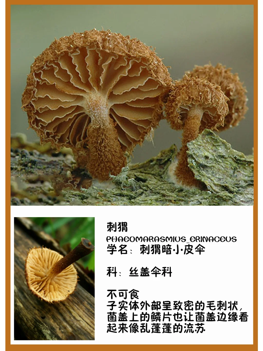 刺猬 phaeomarasmius_erinaceus 学名:刺猬暗小皮伞 科:丝盖伞科 图片©josef hlasek©manatarka.org 不可食 子实体外部呈致密的毛刺状,菌盖上的鳞片也让菌盖边缘看起来像乱蓬蓬的流苏[萌萌哒R]