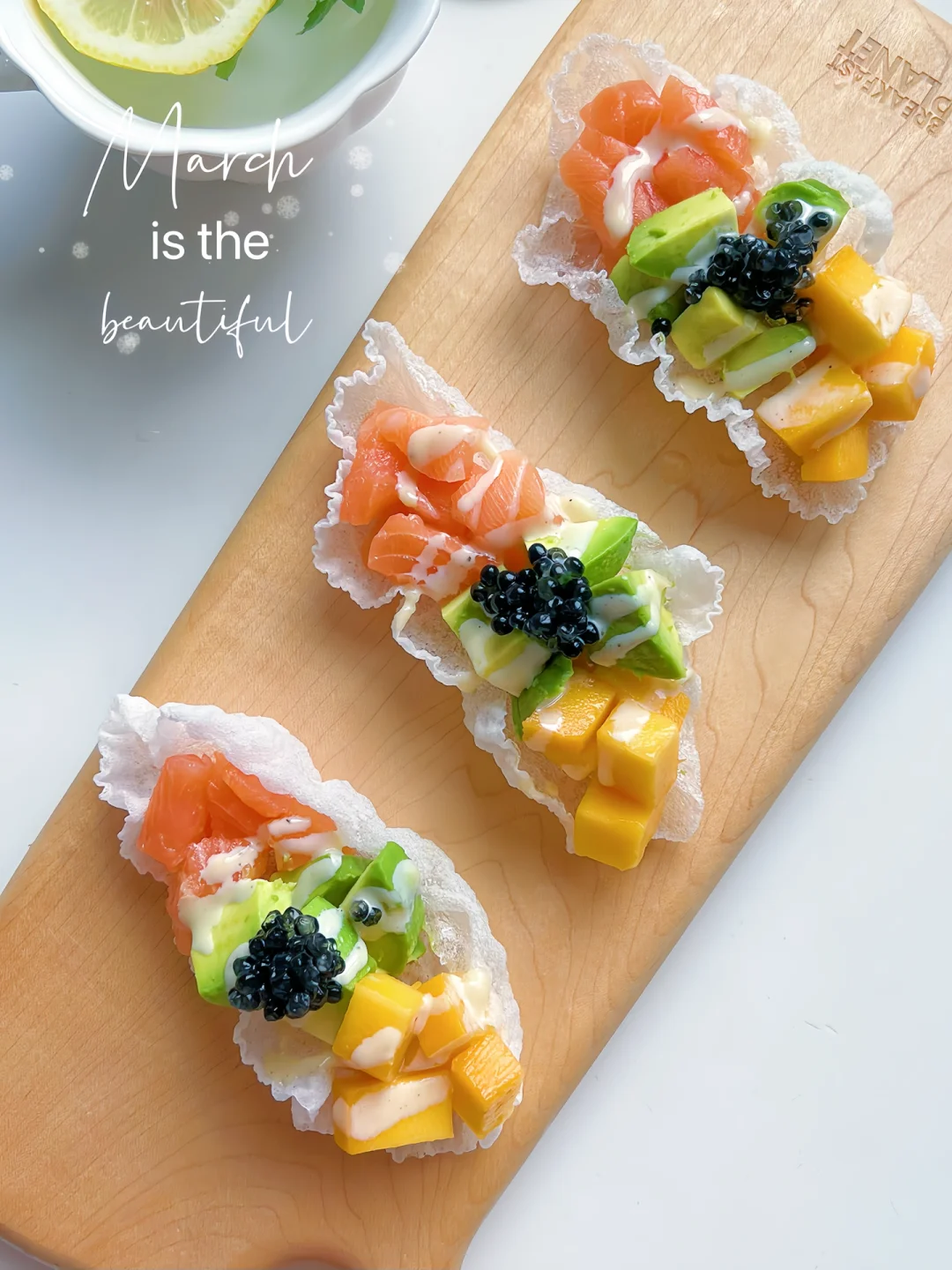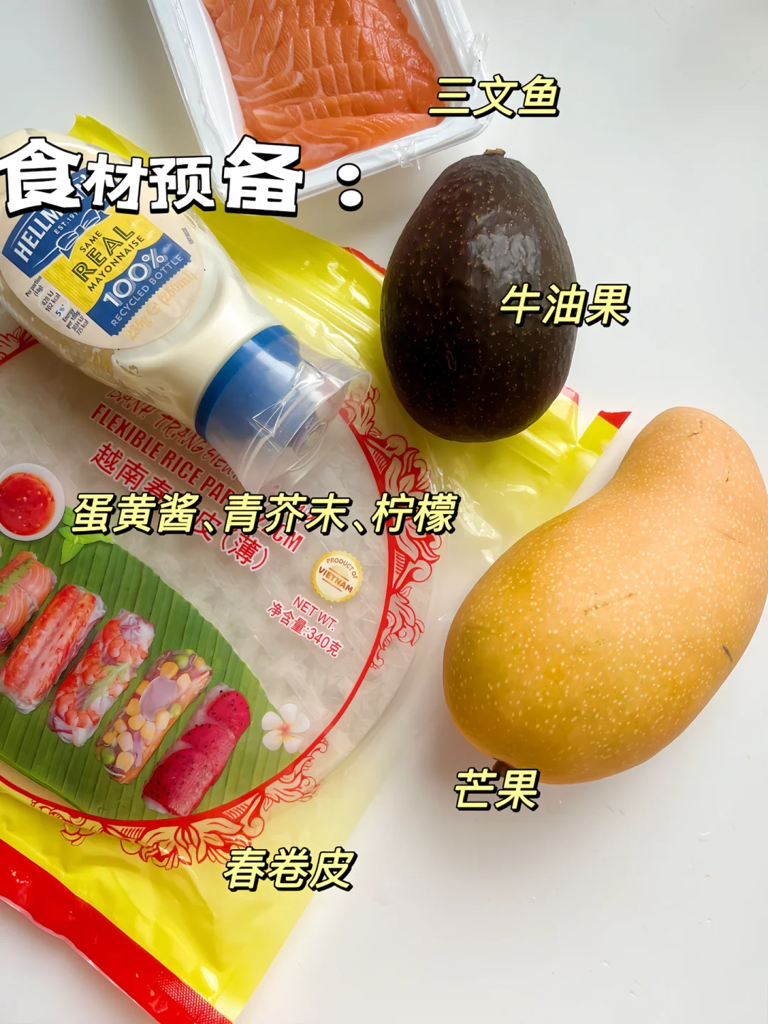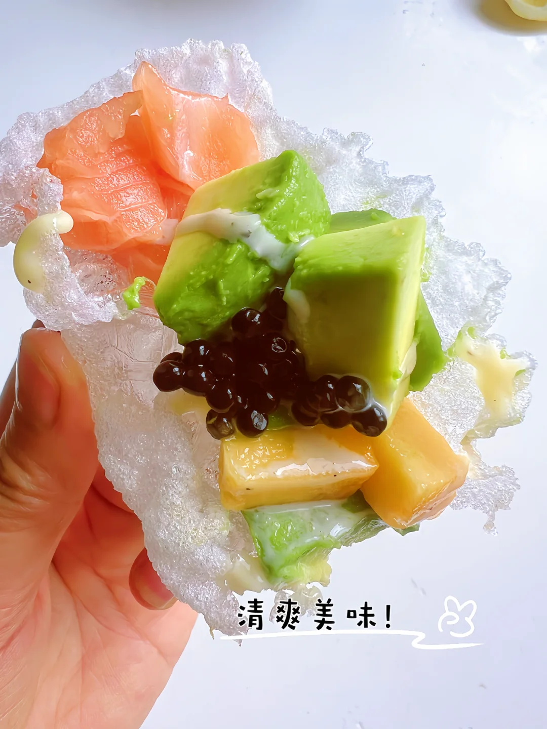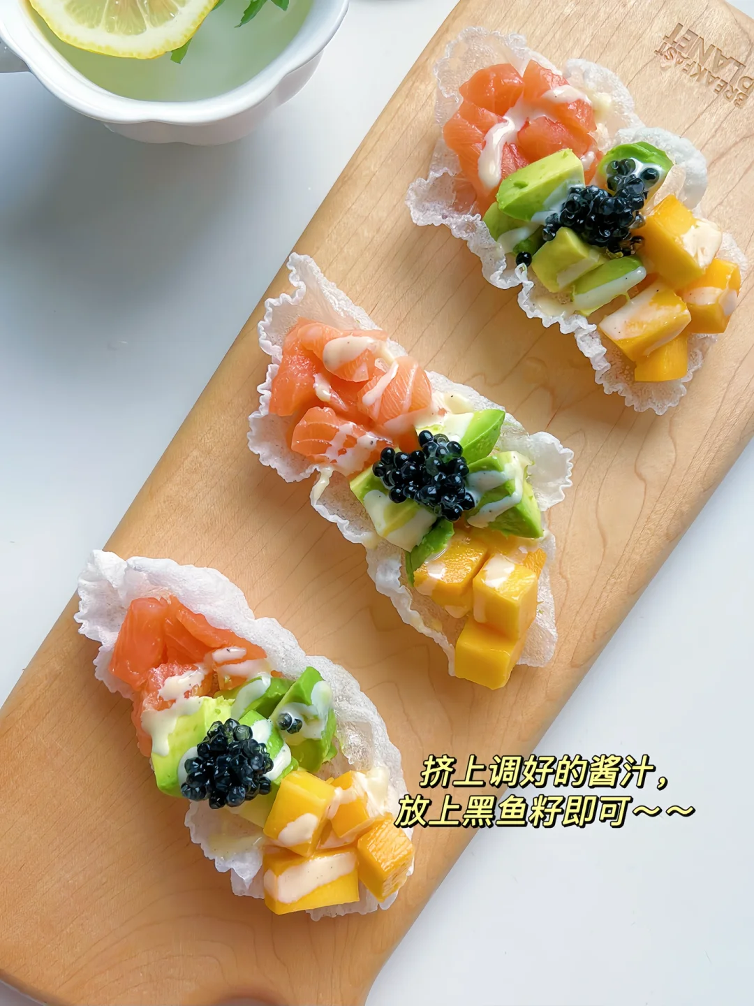 4️⃣组合:把芒果、三文鱼、牛油果放在春卷皮上,挤上调好的酱汁,放上黑鱼籽即可