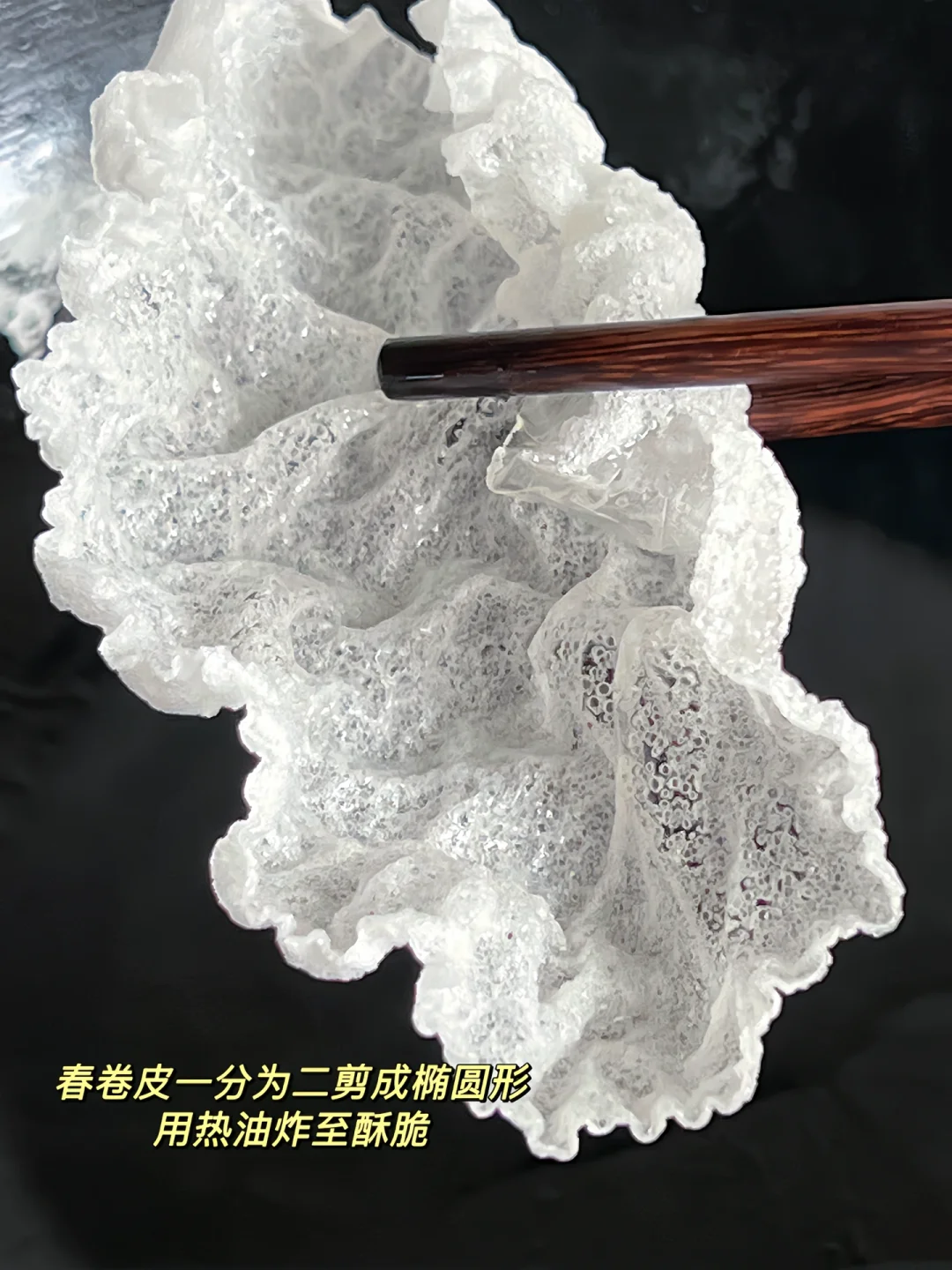 1️⃣春卷皮一分为二剪成椭圆形,用热油炸至酥脆