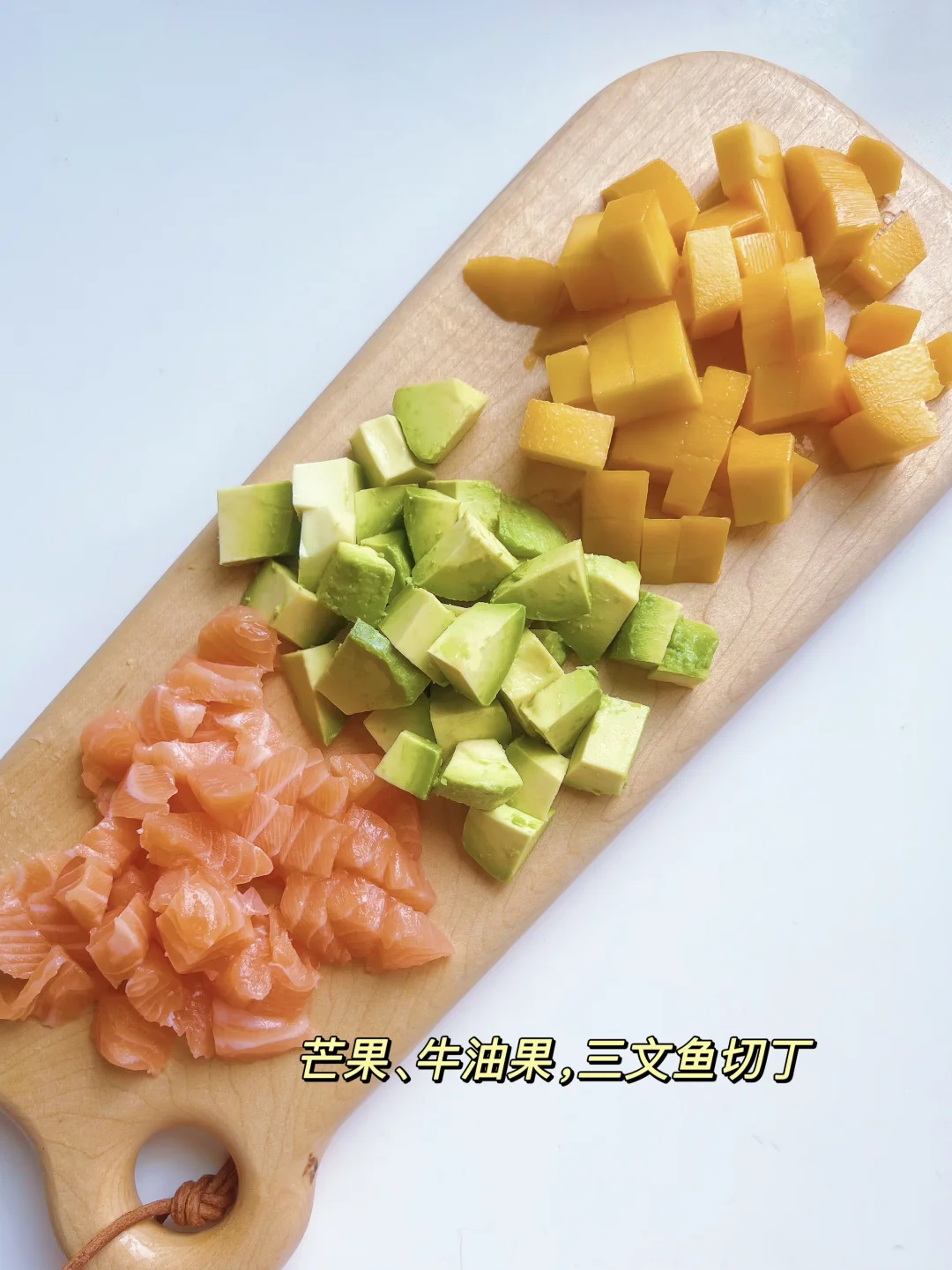 2️⃣芒果、三文鱼、牛油果切丁(挤一点柠檬汁防氧化)