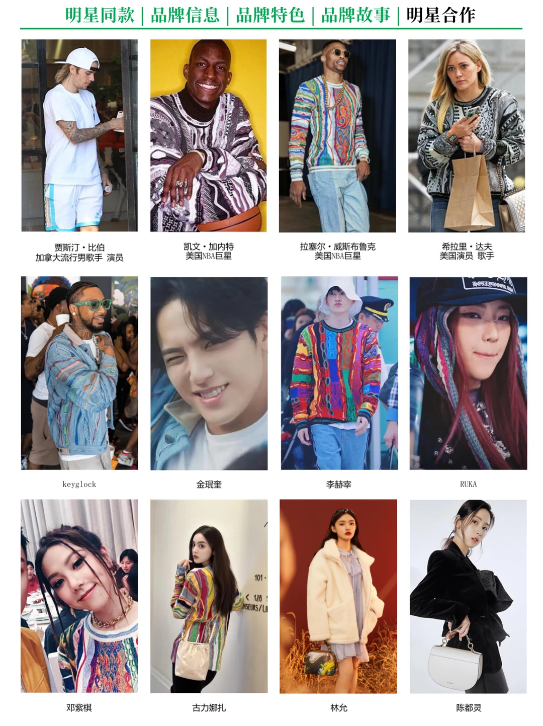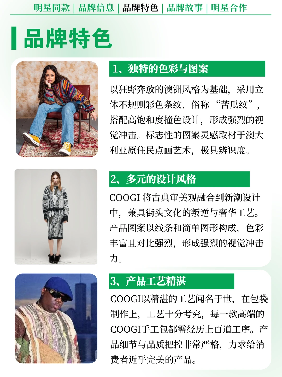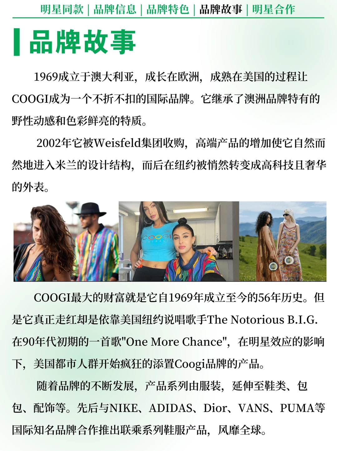 💖 COOGI最大的财富就是它自1969年成立至今的56年历史。但是它真正走红却是依靠美国纽约说唱歌手The Notorious B.I.G.在90年代初期的一首歌"One More Chance",在明星效应的影响下,美国都市人群开始疯狂的添置Coogi品牌的产品。随着品牌的不断发展,产品系列由服装,延伸至鞋类、包包、配饰等。先后与NIKE、ADIDAS、Dior、VANS、PUMA等国际知名品牌合作推出联乘系列鞋服产品,风靡全球。