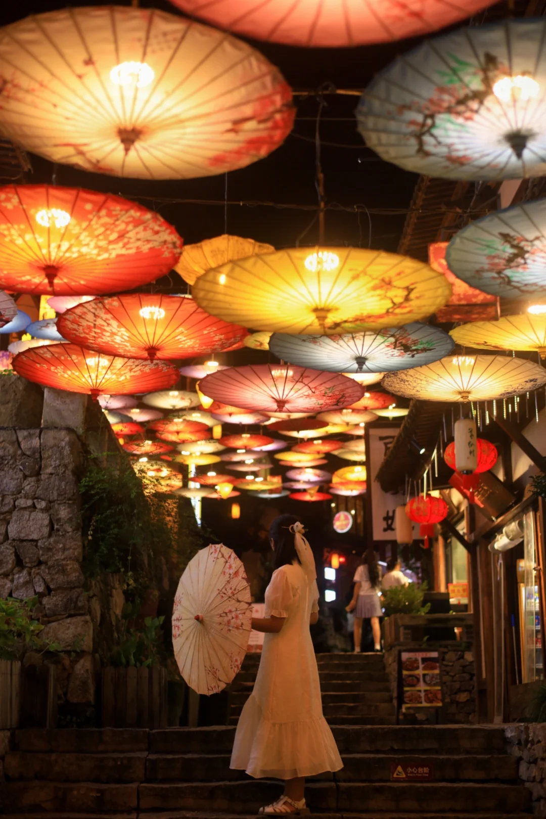 挂满油纸伞的小巷,白天和夜晚都好迷人
