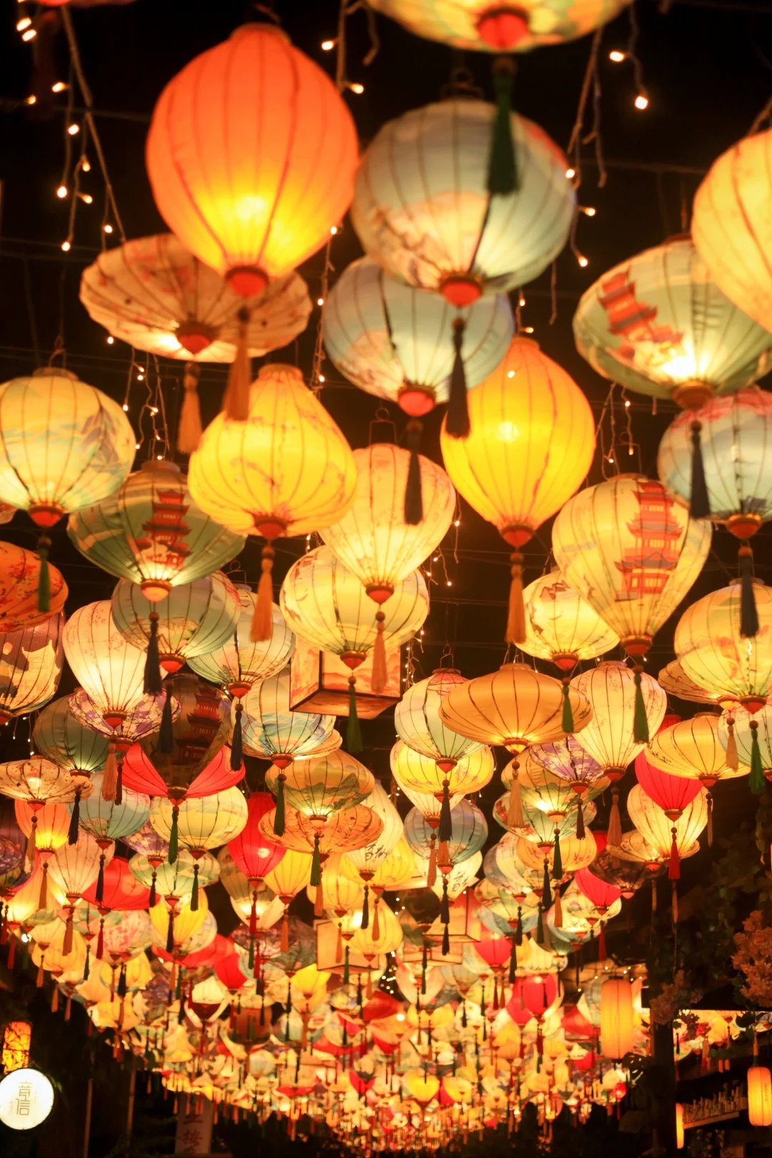 美食众多,挂满了灯笼夜晚好梦幻,穿汉服拍照很出片