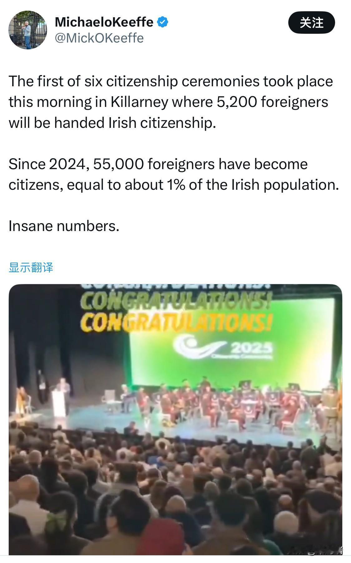 今天上午,在爱尔兰基拉尼的爱尔兰独立选举委员会 (INEC) 举行了六场入籍仪式中的第一场,总计5200名外国人将获得爱尔兰公民身份。 这些仪式在两天(12月1日和2日)内举行,所有六场仪式加起来的总人数约为5200人,新公民来自全球超过132个国家。 自 2024 年以来,已有 55,000 名外国人成为爱尔兰公民,约占爱尔兰人口的 1%。 爱尔兰公民入籍仪式于 2011 年首次引入,目的是以庄严隆重的方式纪念授予公民身份的时刻。 自公民入籍仪式首次引入以来,已举行了 216 场仪式(不包括即将到来的日期),来自 180 多个国家的人们获得了入籍证书。 自 2011 年以来,包括未成年人在内,已有约 222,000 人获得爱尔兰公民身份。12 月在基拉尼举行的入籍仪式后,确认出席的 5,200 多人将计入这一数字。