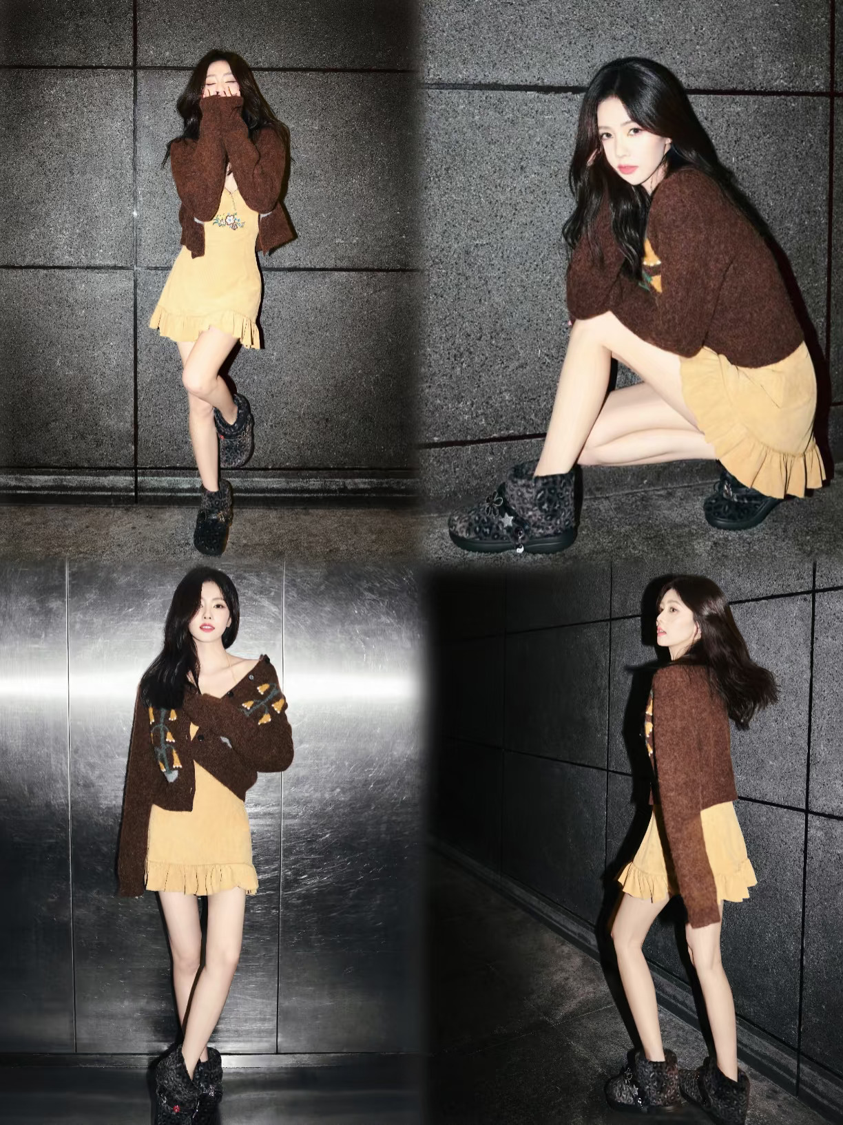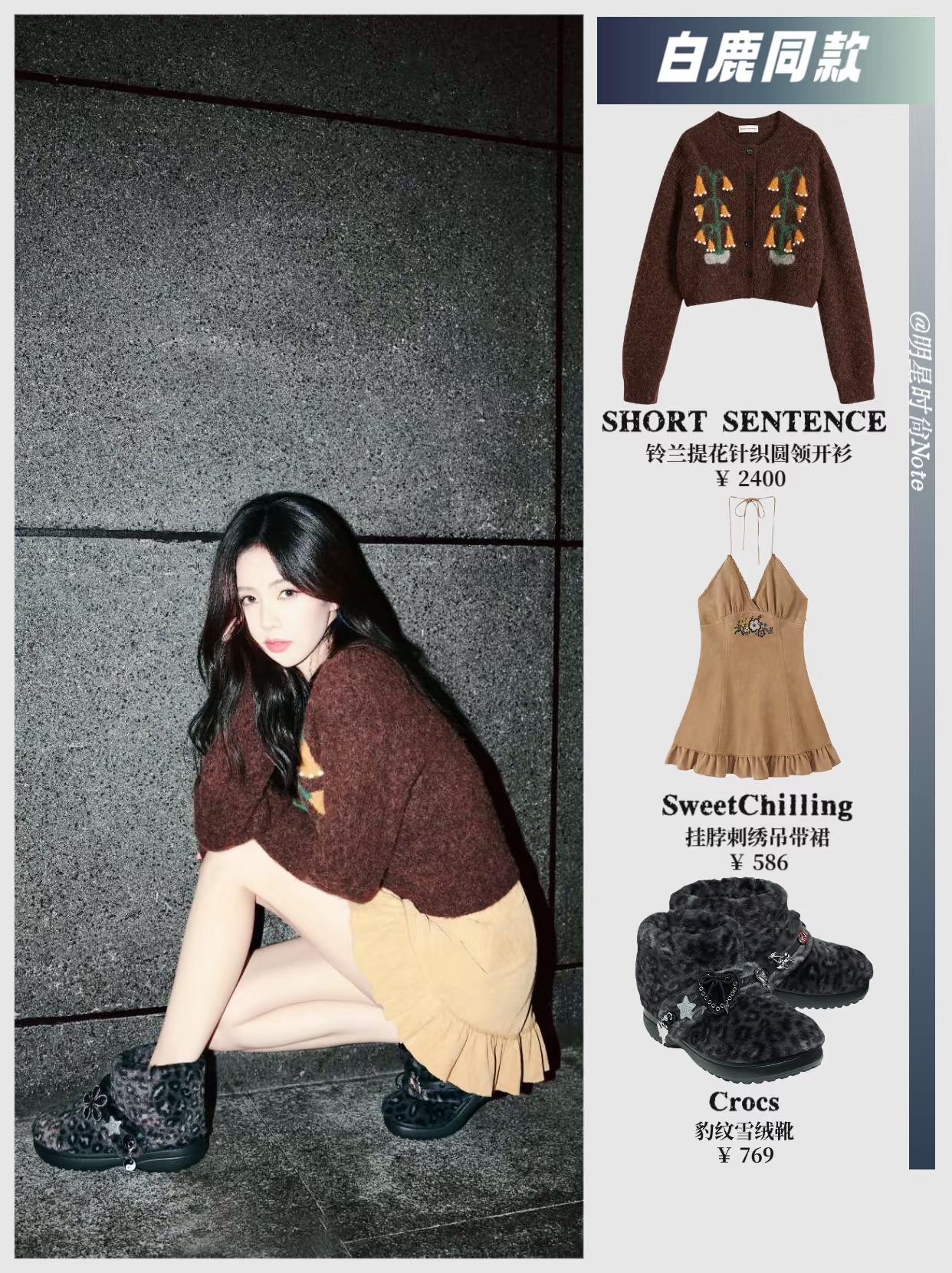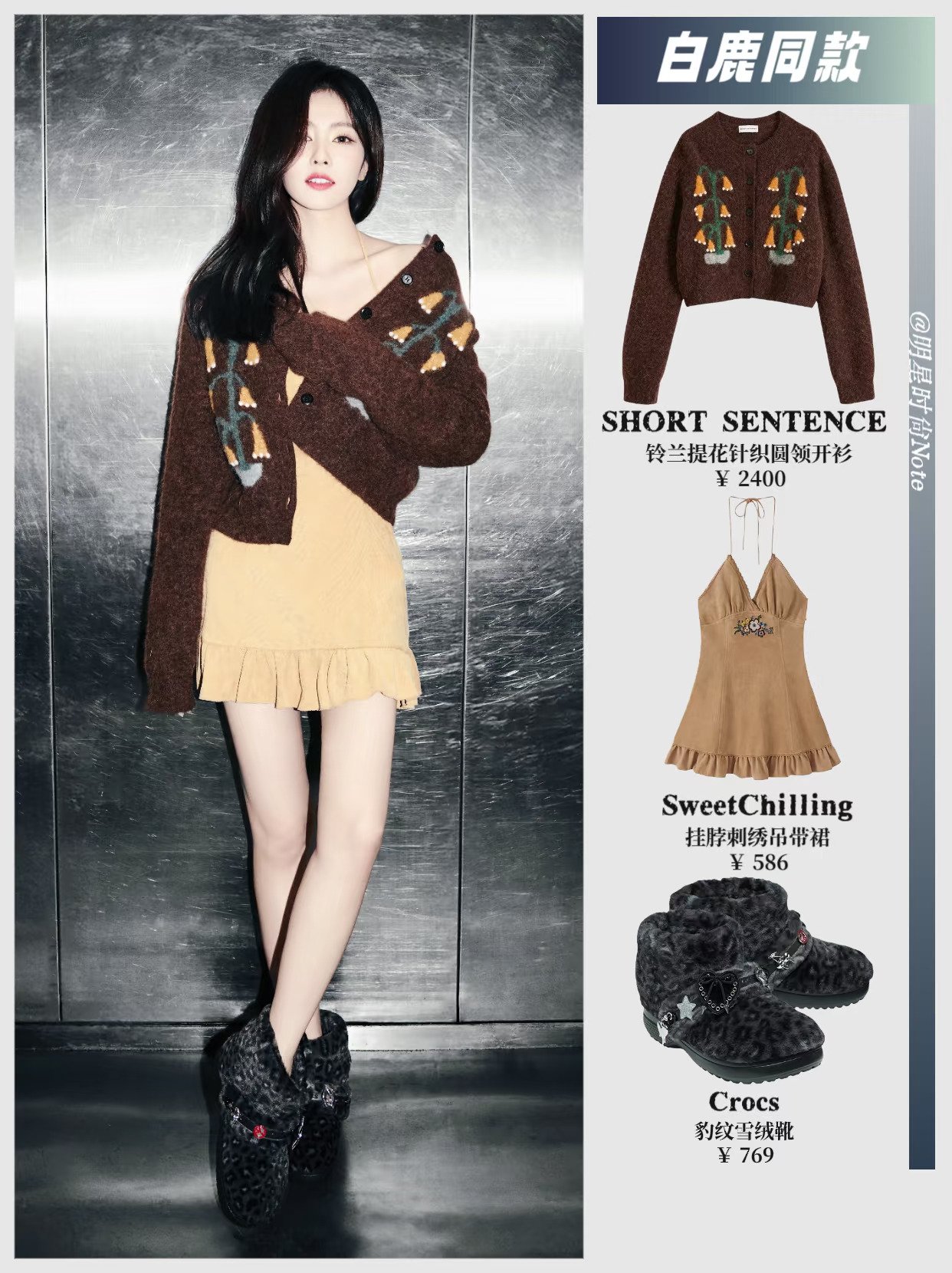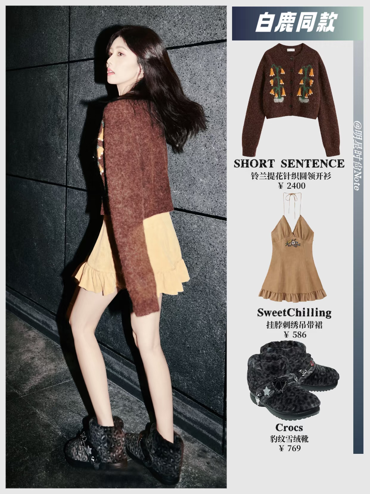 白鹿的这套真的太有故事感了🎞️ 棕色针织开衫一上身,整个人瞬间像从旧胶片里走出来~🤎 温柔又不乏小心思,上面的立体装饰刚好添了点灵动感🌰 搭配那条黄色荷叶边短裙,甜度拿捏得刚刚好,软糯和俏皮在她身上一点都不冲突🍯 再看看脚上的豹纹毛绒洞洞鞋,微微的复古调子太绝配了,慵懒又自在, 就像秋日下午偷懒喝奶茶的那种松弛感☕ 素材来源:白鹿 #白鹿 #白鹿同款 #明星同款 #仙女下凡白梦妍 #绝世美女白梦妍 #向全世界安利白鹿 #秋冬穿搭 #ootd #ootd每日穿搭自
