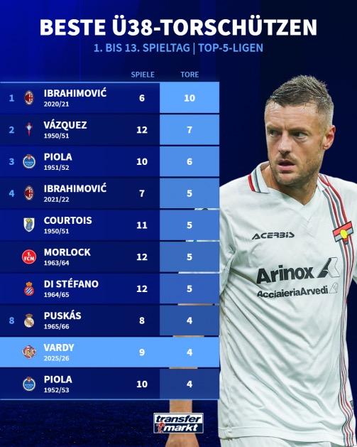 虎扑12月02日讯德转统计了五大联赛历史上前13轮后,38岁以上球员射手榜。