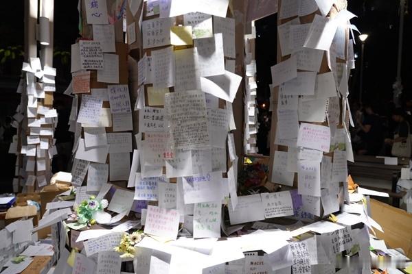 香港宏福苑五級大火增至156人死亡,仍有30人失踪。今天(12月2日)是遇難者「頭七」。在大埔廣福休憩處,有市民排隊到場獻花,涼亭內貼滿悼念紙條,向遇難者表達追思,場面傷感。