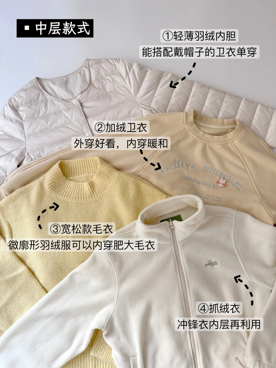 ②中间层要选微宽松的,套着穿不卡胳肢窝,而且还能留出空气导热。