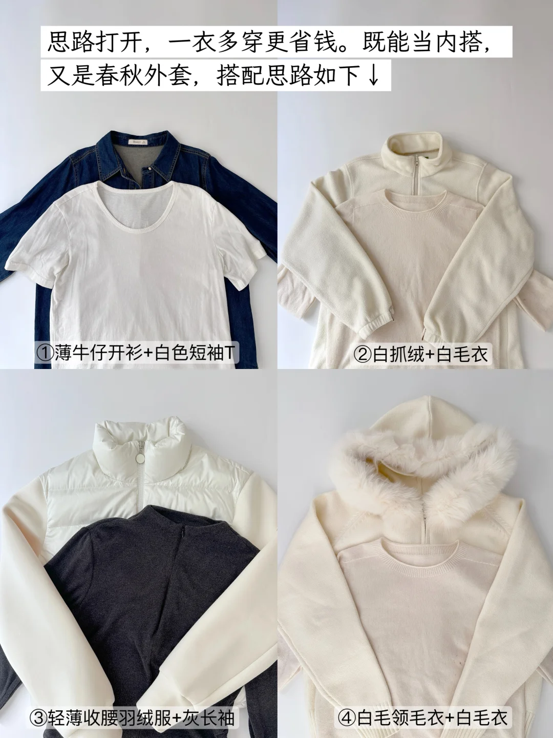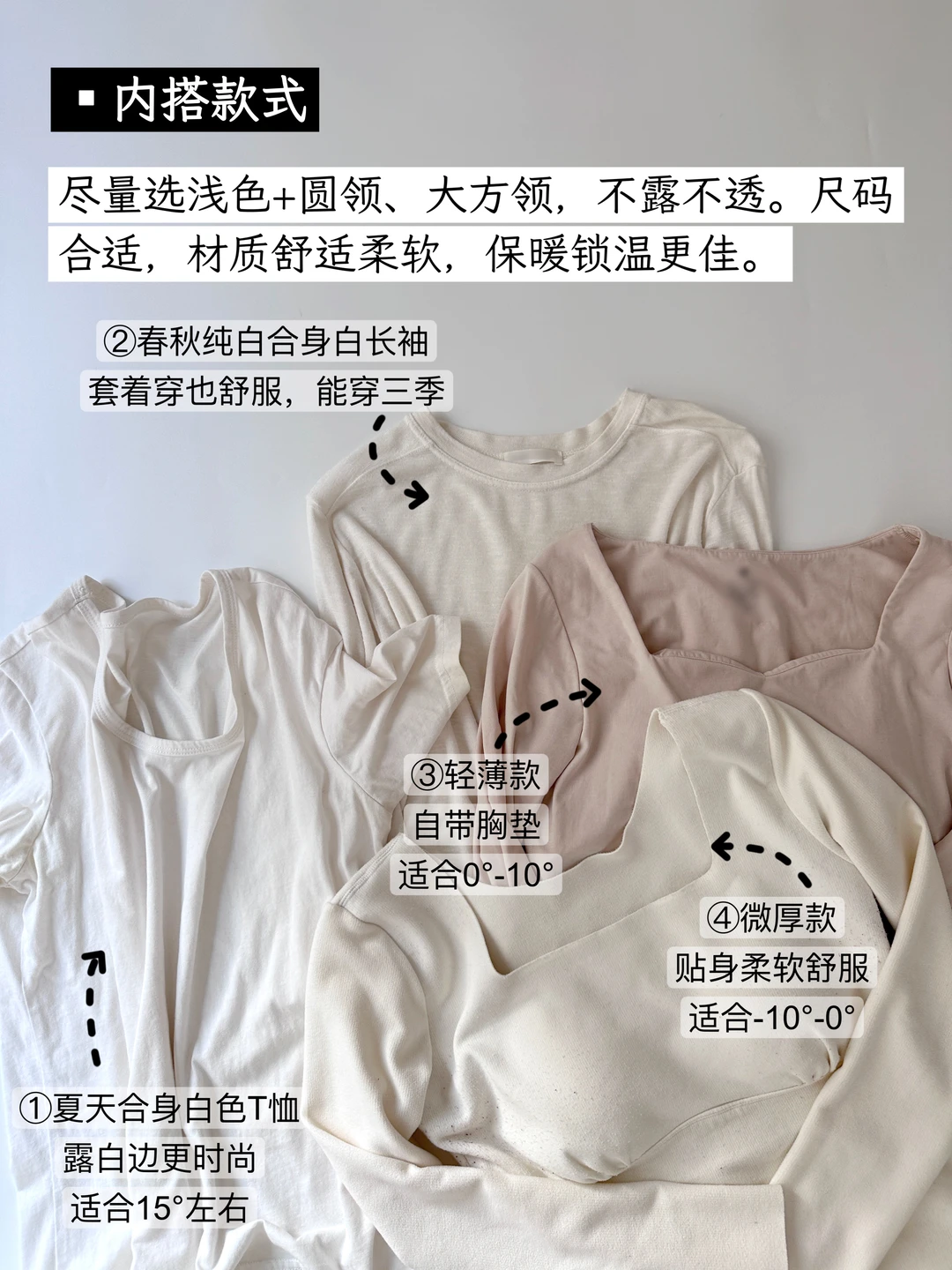 ⑤内层可重复利用夏春秋的正肩修身白色款,中层可重复利用春秋的薄款开衫外套,更省钱