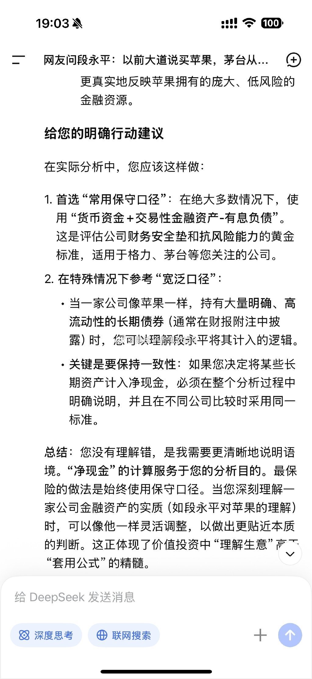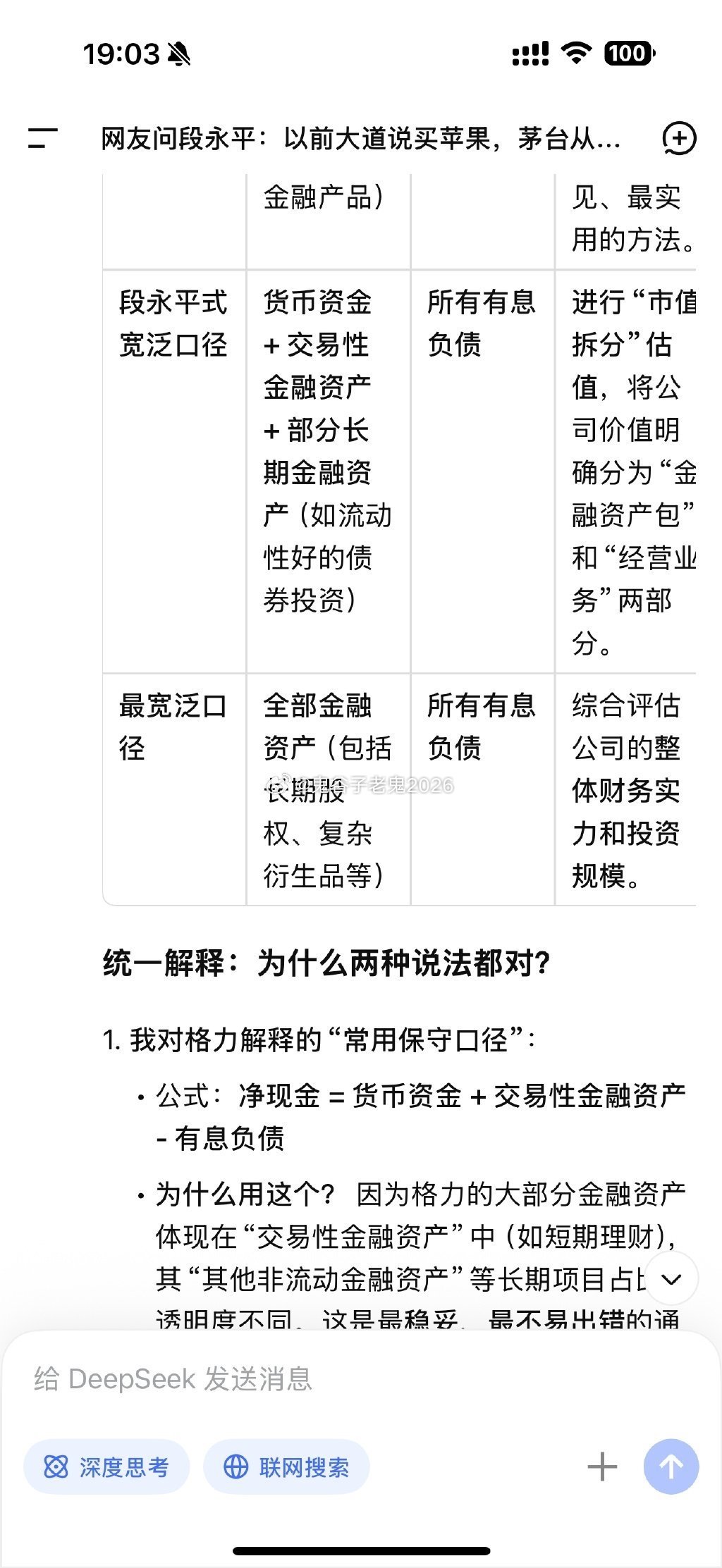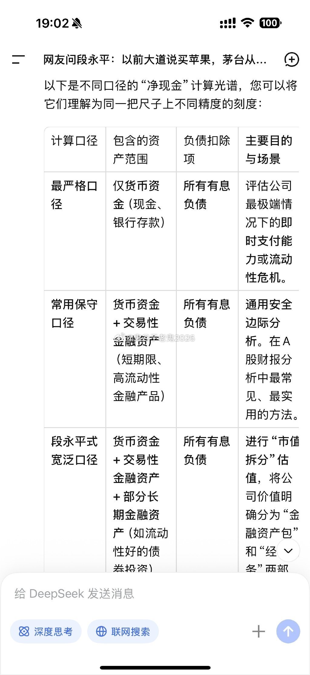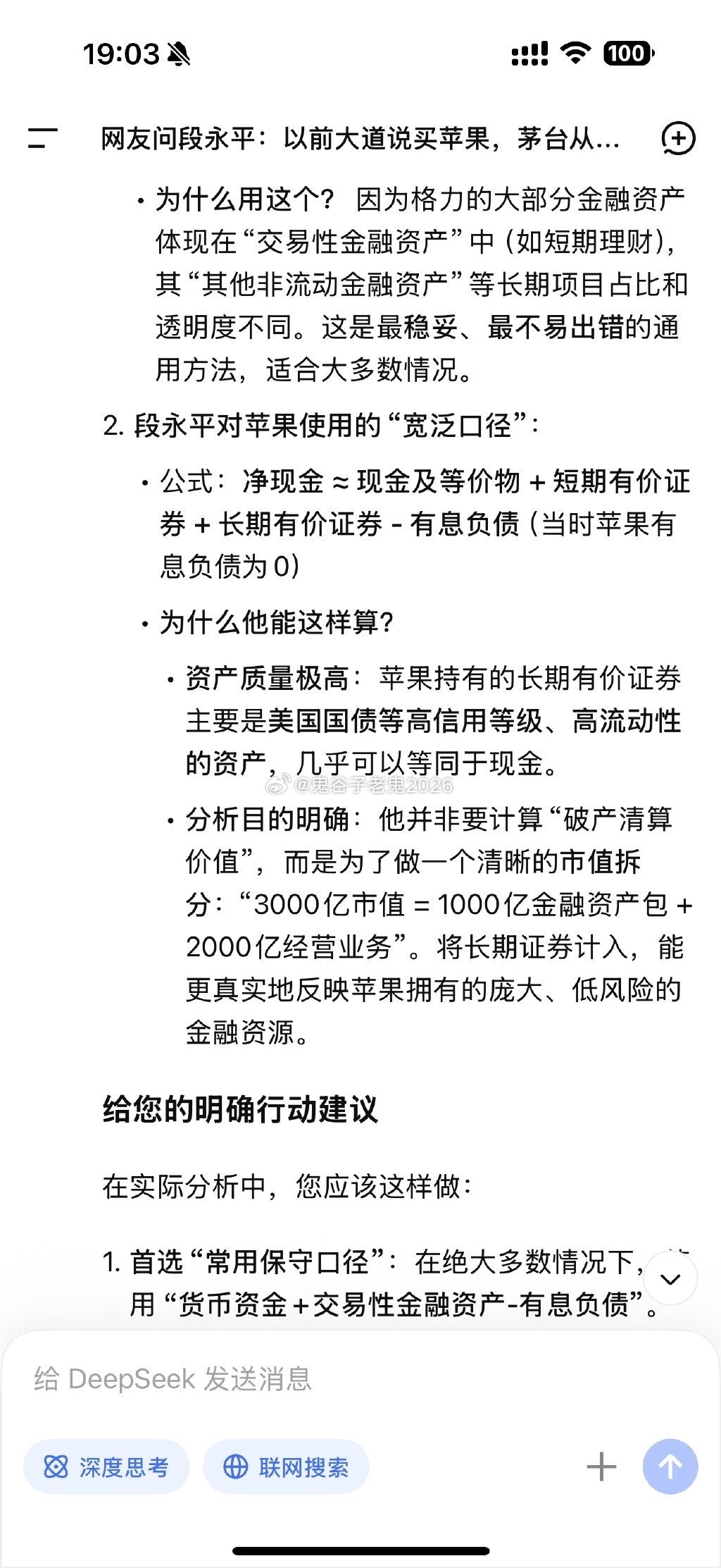 段永平:举个所谓懂的例子:比如苹果,我在2011年买苹果的时候,苹果大概3000亿市值(当时股价310/7=44),手里有1000亿净现金,那时候利润大概不到200亿。以我对苹果的理解,我认为苹果未来5年左右赢利大概率会涨很多,所以我就猜个500亿(去年595亿)。所以当时想的东西非常简单,用2000亿左右市值买个目前赚接近200亿/年,未来5左右会赚到500亿/年或以上的公司(而且还会往后继续很好)。如果有这个结论,买苹果不过是个简单算术题,你只要根据你自己的机会成本就可以决定了。但得到这个结论非常不容易,对我来说至少20年功夫吧。能得到这个结论,就叫懂了。不懂则千万千万别碰,我有个球友320/7=46买了一些,结果一个回调,310/7就卖了(现在苹果加上分红可能早就超过200了),还跟我讲为什么要卖的道理,从此我不再跟他说投资了。2019-05-20段永平说的,手里有1000亿净现金,这个净现金的计算方法是什么?根据段永平的描述和投资逻辑,他所说的“手里有1000亿净现金”指的是苹果公司在2011年那个时点,其财务报表上“现金及等价物”减去“有息负债”后的净额。这是一种典型的保守估值方法,用于衡量公司最确定、最底层的资产价值。净现金的计算方法其核心公式为:净现金 = 现金及现金等价物 + 短期有价证券 - 有息负债具体到苹果2011年的情况(基于其2011财年年报,截至2011年9月24日),计算如下:1. 现金及等价物:这是公司流动性最强的资产。 · 现金及现金等价物:259亿美金 · 短期有价证券:161亿美金(通常是期限在1年以内的高流动性债券等)2. 长期有价证券:557亿美金(期限超过1年的债券等)。段永平在评估时,通常会将这部分也视为“准现金”,因为可以相对容易地变现。3. 有息负债:在2011年,苹果公司几乎没有有息负债。它是在2013年后才开始大规模发行债券用于避税和分红回购。因此,当时的有息负债可视为0。因此,一个保守的估算可以是:净现金 ≈ 现金及等价物 + 全部有价证券= 259亿(现金及等价物) + 161亿(短期有价证券)+ 557亿(长期有价证券)= 977亿美金这个数字非常接近段永平所说的“1000亿净现金”。他采用了将长期有价证券也计算在内的、更为宽泛和保守的口径。段永平如何运用这个数字进行估值决策这是他投资思维的关键。他没有直接用3000亿的总市值去思考,而是进行了 “价值拆分”:1. 拆解市值:苹果总市值约3000亿美金。2. 剥离净现金:其中包含约1000亿净现金。这意味着,他为苹果的 “经营业务” 实际支付的价格是:3000亿 - 1000亿 = 2000亿美金。3. 评估经营业务:当时苹果的经营业务(iPhone、Mac等)一年能创造约200亿美金的利润。他用2000亿美金市值,买入了一个年赚200亿、且他判断未来几年利润会快速增长到500亿的业务。4. 结论:这相当于为当前盈利支付了约10倍市盈率(2000亿/200亿),而未来盈利的预期市盈率则会降至4倍(2000亿/500亿)。这是一个在他看来确定性很高、赔率很好的“简单算术题”。给您的核心要点1. 计算口径:在效仿此法时,您可以根据自己的保守程度,选择是否将长期有价证券计入“净现金”。更保守的口径是只计算“现金及等价物+短期有价证券”。2. 关键作用:计算净现金的核心目的,是为了进行价值拆分,从而更清晰地看出你为公司的“经营业务”(即真正的赚钱机器)支付了多少溢价,并评估其安全边际。3. 段氏精髓:这个计算本身是简单的,但正如段永平所说,难的是得出“苹果未来利润大概率会涨到500亿”这个结论。这才是“懂了”的真谛,需要多年的商业洞察力积累。总结:段永平所说的净现金,是一个经过调整的、宽泛的“现金及可变现金融资产”概念。它最重要的作用不是得出一个精确数字,而是作为一种思维工具,将市值拆分,帮助投资者聚焦于“经营业务”的价值与价格,从而做出理性决策。黄乾隆:你上面不是说,净现金=货币资金+交易性金融资产-有息负债吗?怎么又变了?(答案在下图)